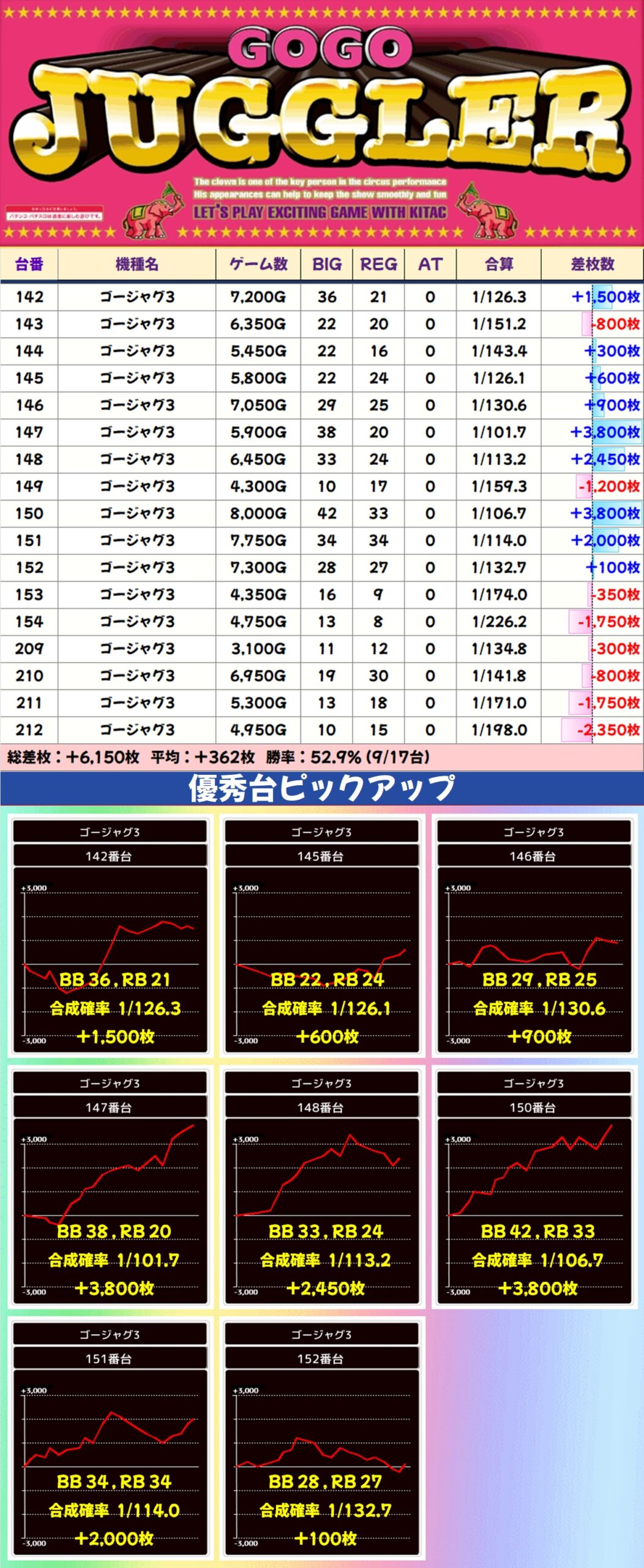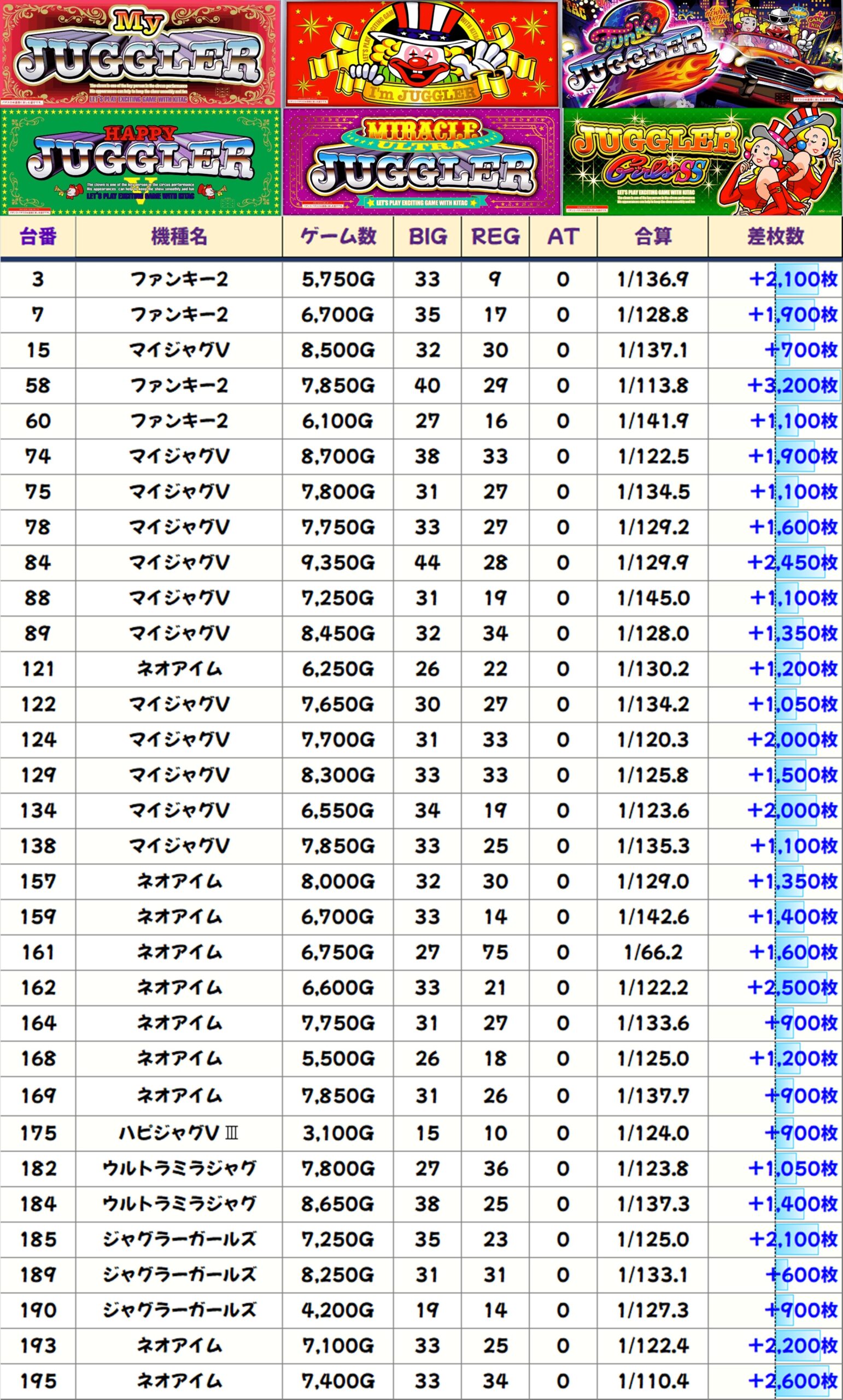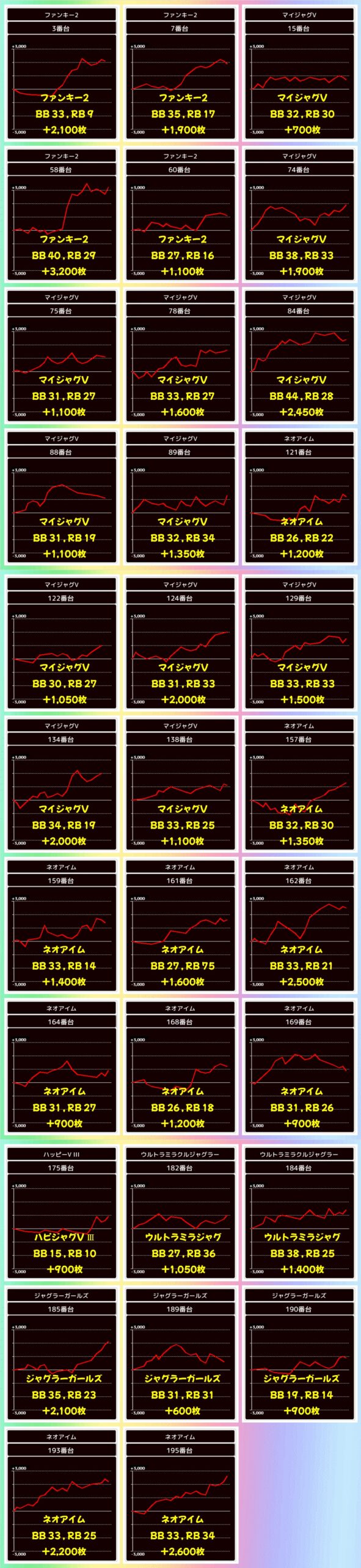ジャグラーシリーズではゴージャグが17台中9台プラスと好調。その他メインのマイジャグ・ネオアイムを筆頭に+1,000枚オーバーの優秀台やボーナス合算良好台が散見され、全体的に賑わっていました。多台数機種だけでなく少台数機種にもしっかりお宝が用意されているので、どの機種も狙い目になります。