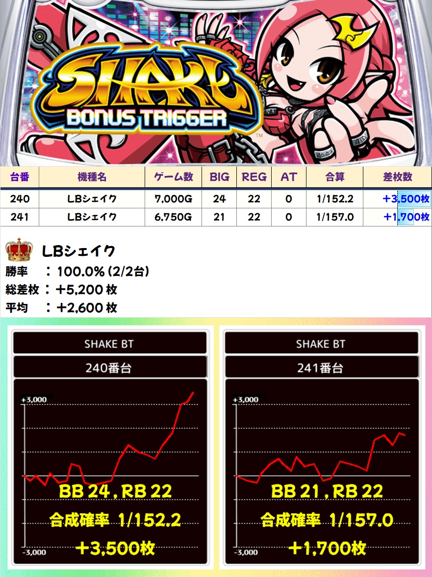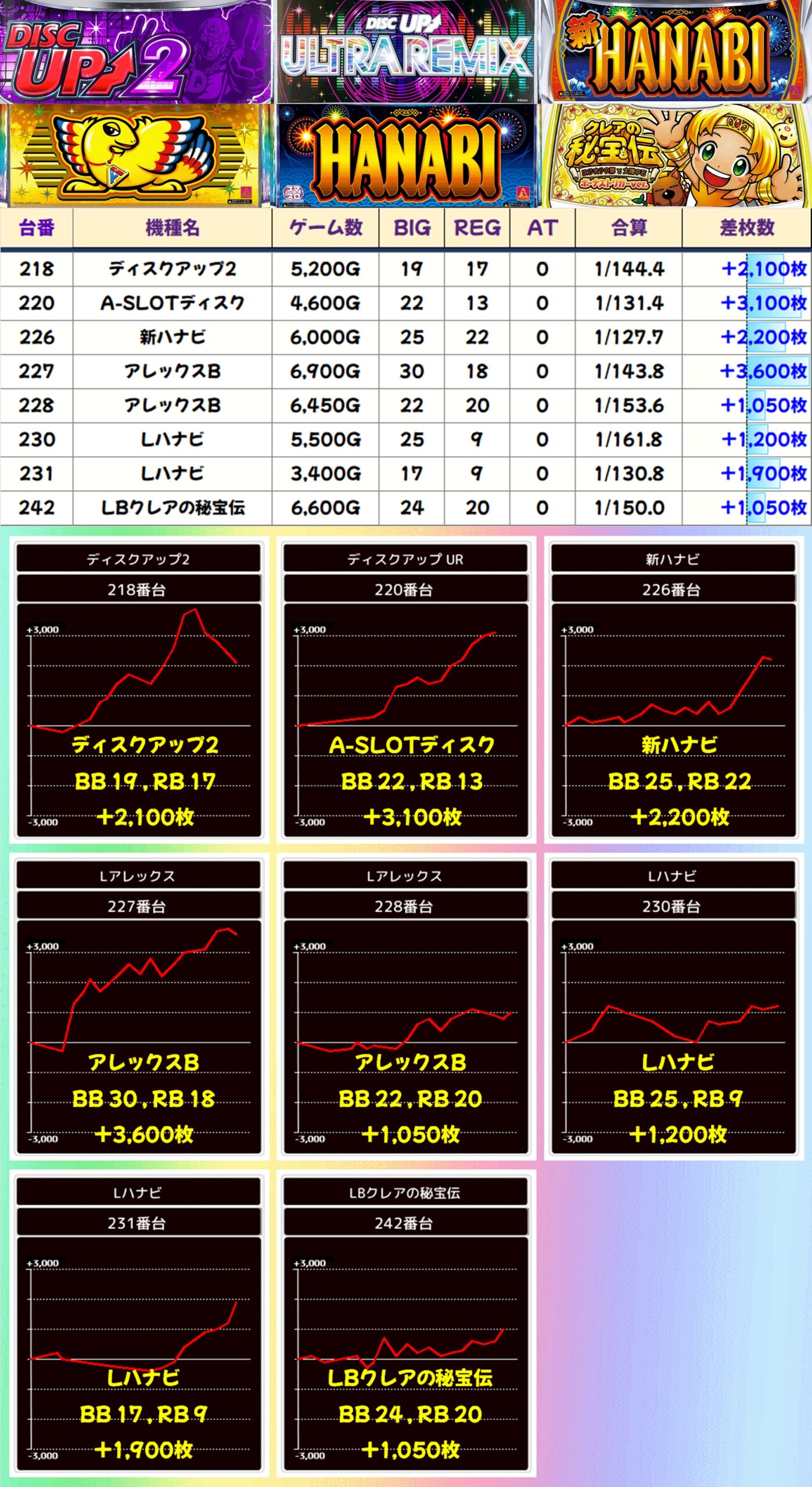 ノーマル・BT機コーナーからも優秀台が続出。2台設置のLBシェイクは全台系濃厚で平均+2,600枚と優秀な結果を残しており、ディスク2・A-SLOTディスク・新ハナビには+2,000枚オーバー台が、アレックスBには+3,000枚オーバー台があったりと、こちらも抜かりない仕掛けが用意されていたようです。