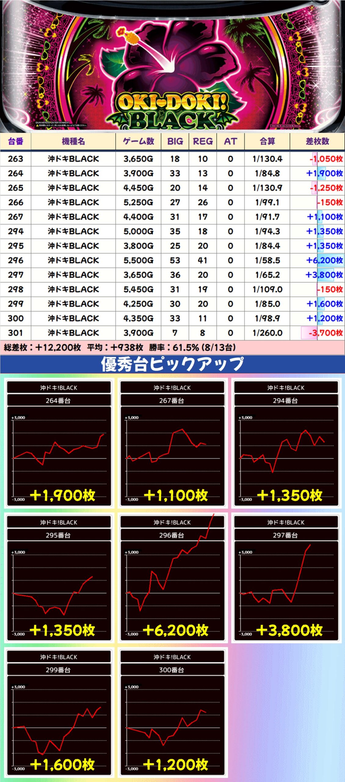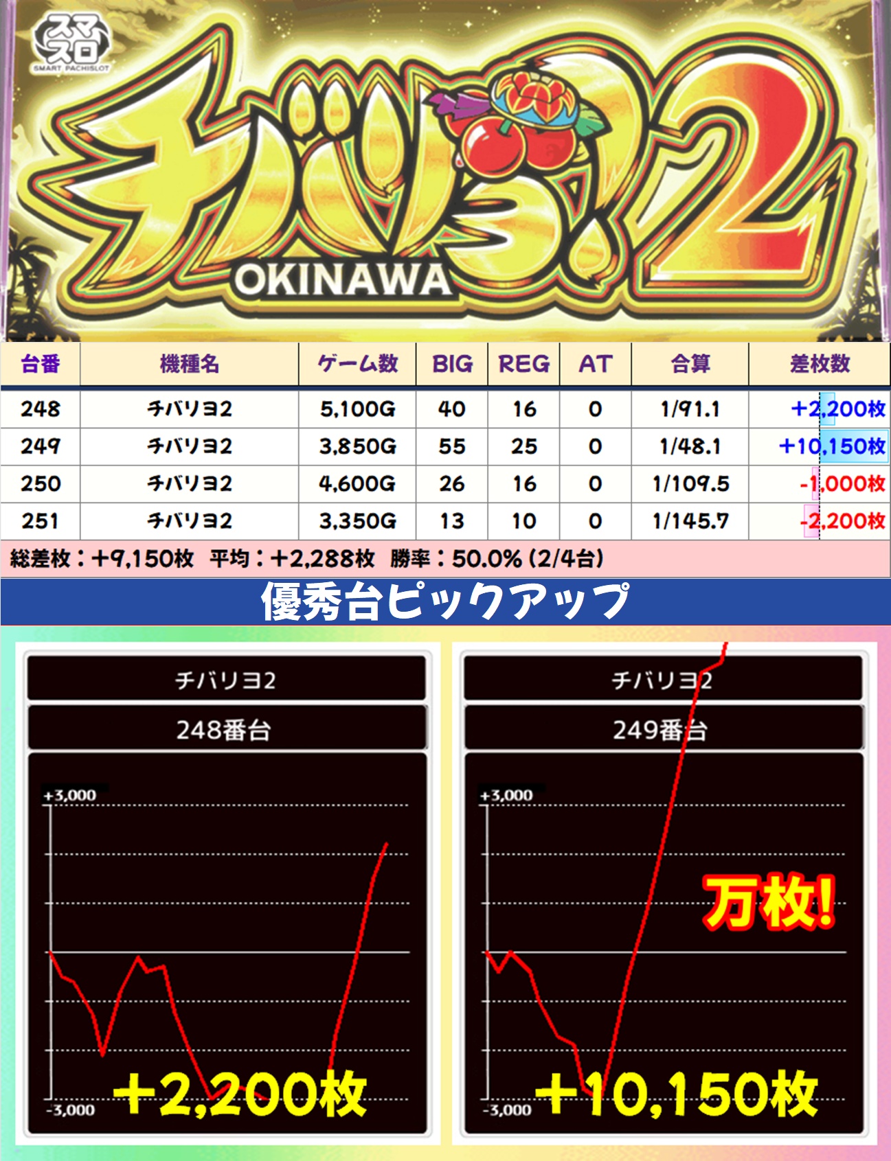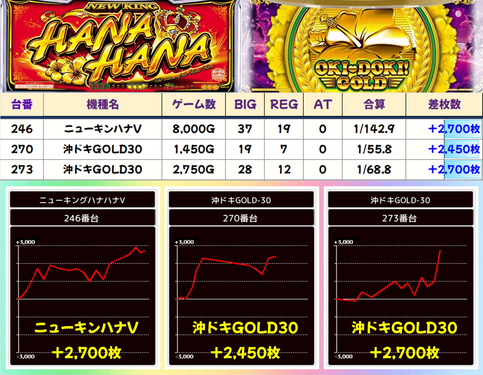 今回の沖スロは沖ドキゴージャスが全台系濃厚で平均約+2,000枚という好成績。ほかにも沖ドキBLACK・キンハナ・チバリヨ2が高配分と思われる結果で、チバリヨ2からは万枚突破台も出現しました。3の日の沖スロは高確率で複数機種に仕掛けがあるため、今後も積極的に狙っていきましょう!
