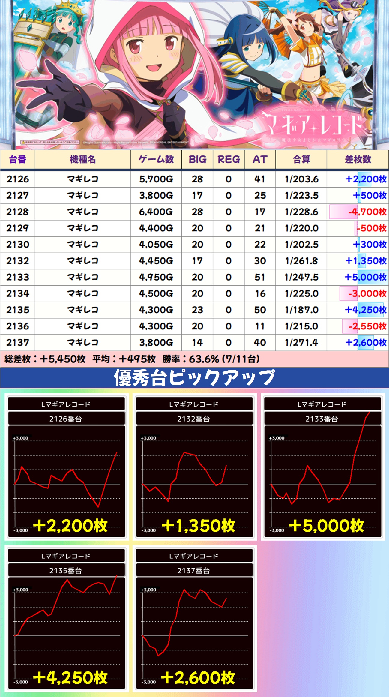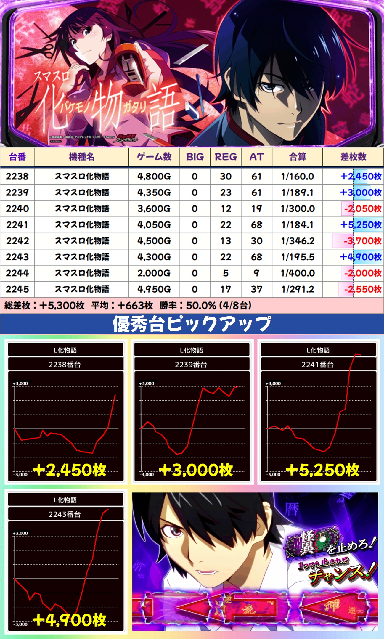主力機はマギレコ・炎炎ノ消防隊2・化物語が半数以上プラス差枚になっており、いずれも高配分以上と思われる内容。増台したモンキーVからも大量出玉の優秀台が複数確認でき、随所で盛り上がっていました。主力機にも必ず仕掛けが用意されているので、優先的に狙う価値アリ!