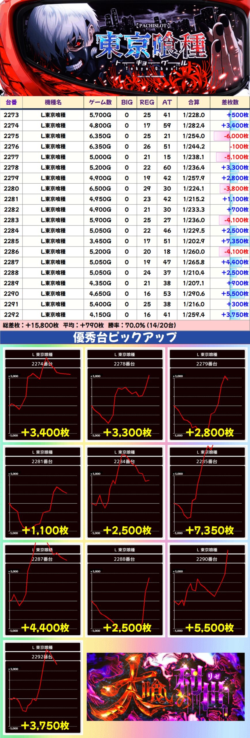 毎日オススメ機種は東京喰種が勝率70%と優秀で、特に多くの優秀台が出現。それ以外の機種にも大量出玉の爆裂台が散見され、かぐや様からは万枚突破台も確認できました。こちらは連日お宝投入率が高めになっているので、常に狙い目になります。