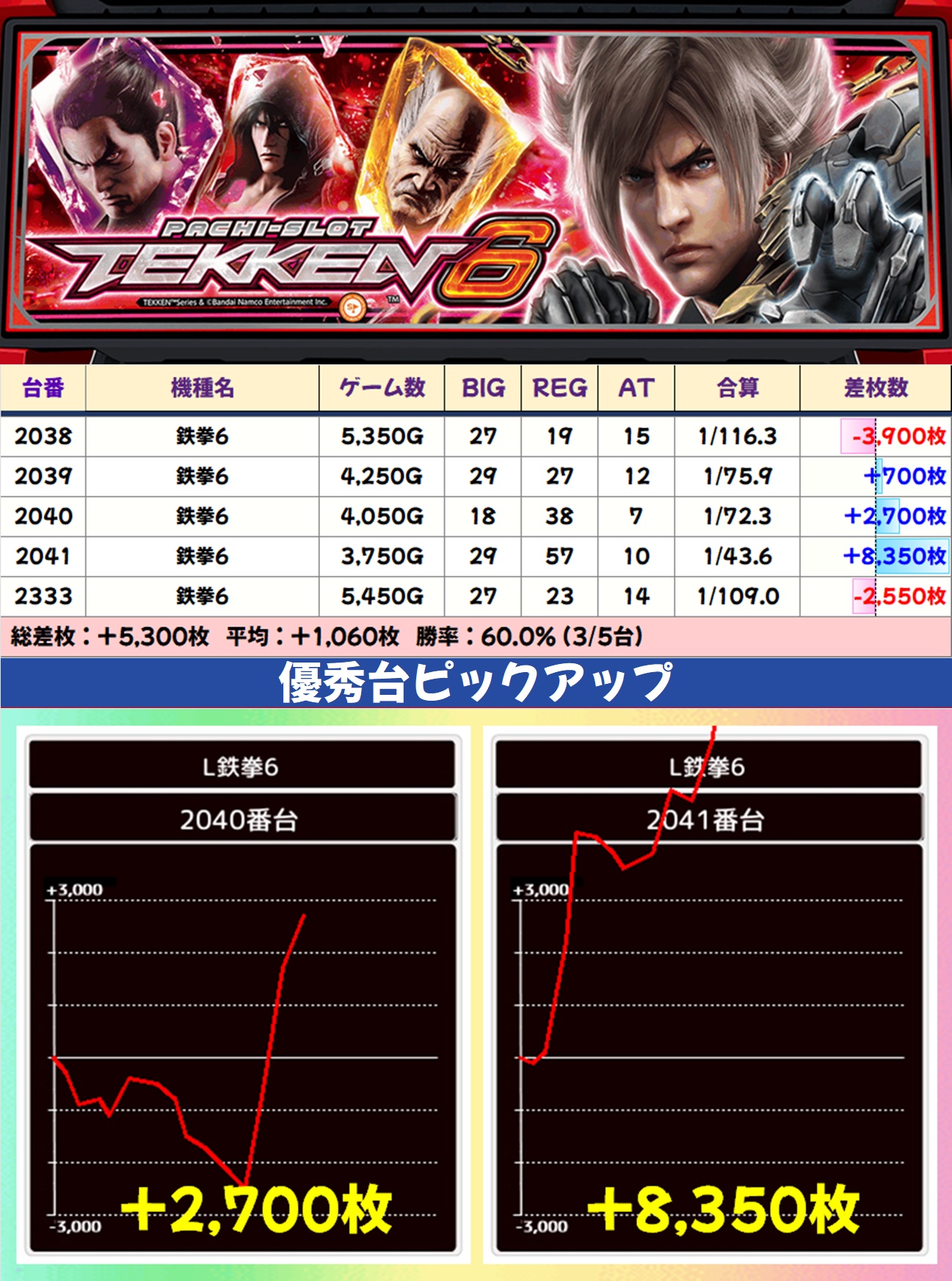 鉄拳6も5台中3台がプラスで平均+1,000枚オーバーと優秀。2041番台は序盤から一気に出玉を伸ばし、その後も右肩上がりのグラフで+8,000枚以上をお持ち帰りという素晴らしい結果でした。