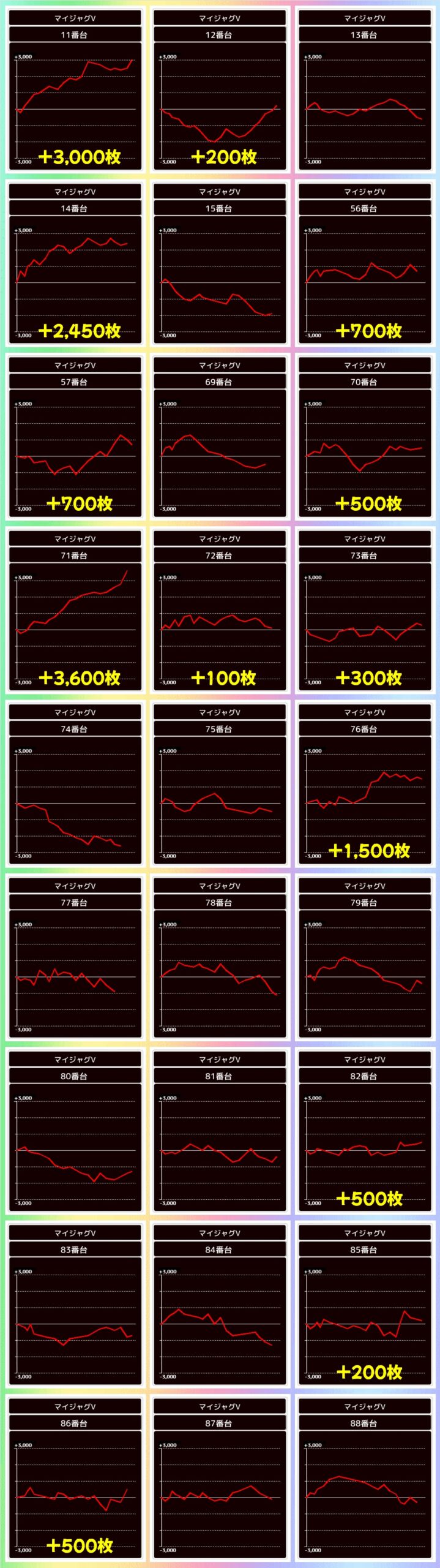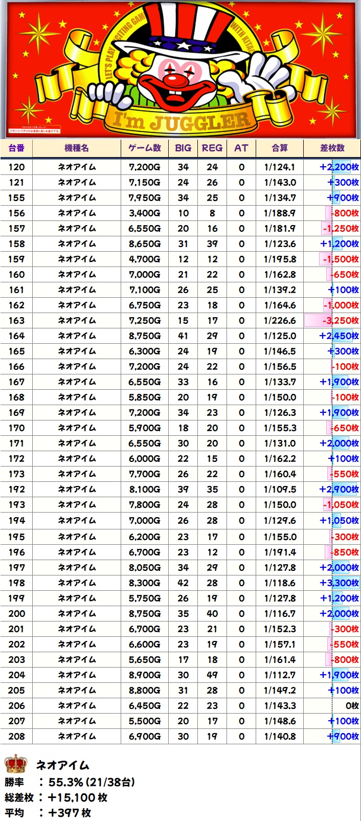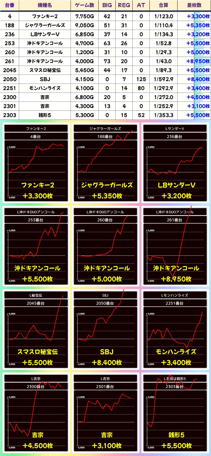 毎回仕掛けのあるジャグですが、今回は多台数のマイジャグやネオアイムが好結果に!上記以外に単品優秀台も散りばめられていました!