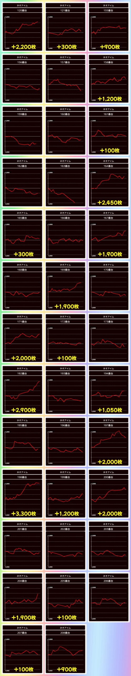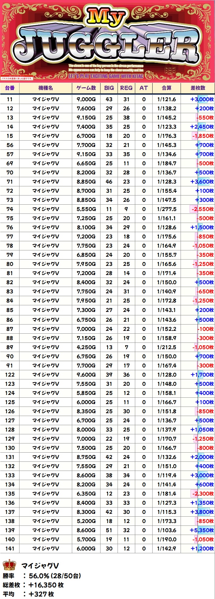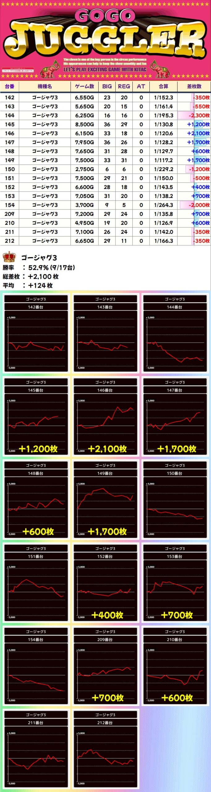 毎回仕掛けのあるジャグですが、今回は多台数のマイジャグやネオアイムが好結果に!上記以外に単品優秀台も散りばめられていました!