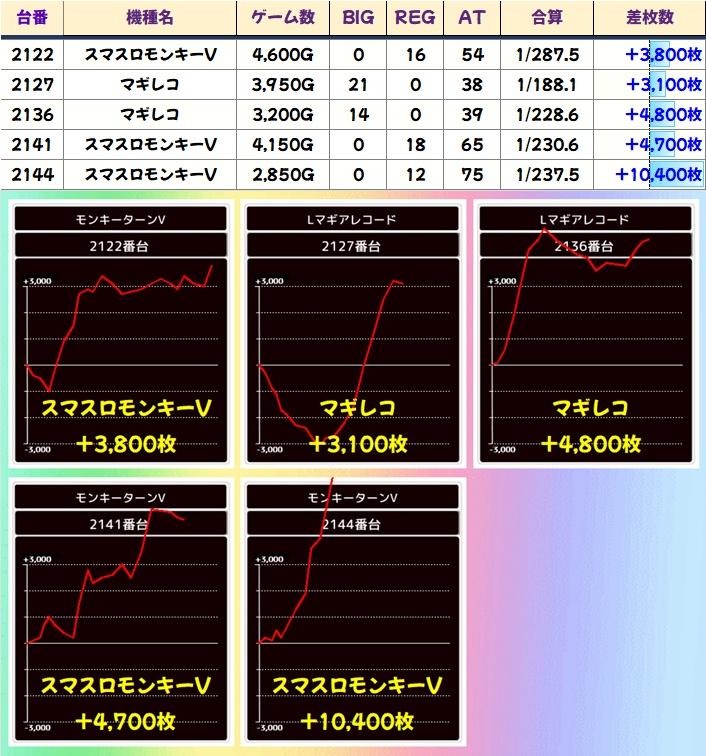 残りの主力機であるモンキーVやマギレコも高挙動台あり!モンキーからは万枚台も!