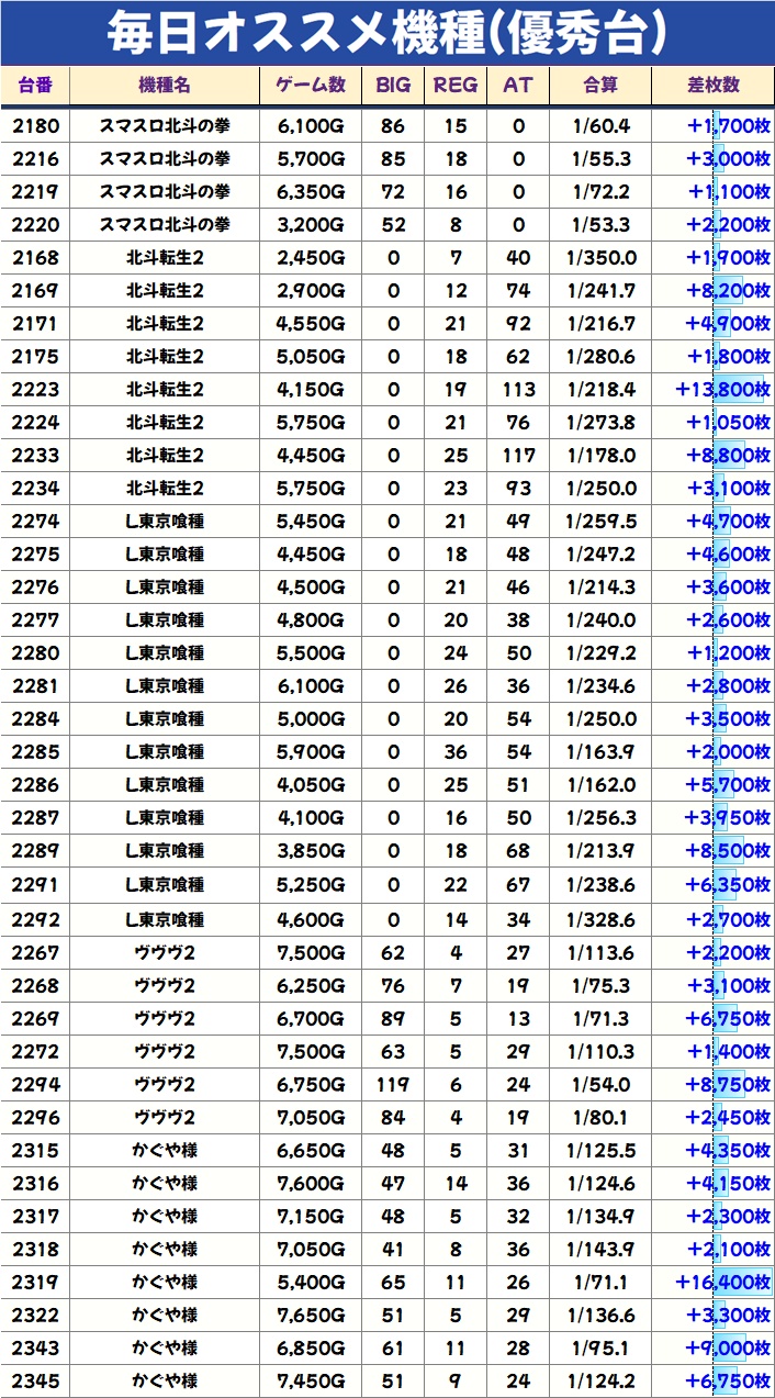 現在の毎日オススメ機種は上記5種類で、今回は特にかぐや様が優秀でした!7の日も絡んでいるので、北斗も扱いヨシ!特日の毎日機種は特に扱いが良いので、良番であれば積極的に狙うのもあり!