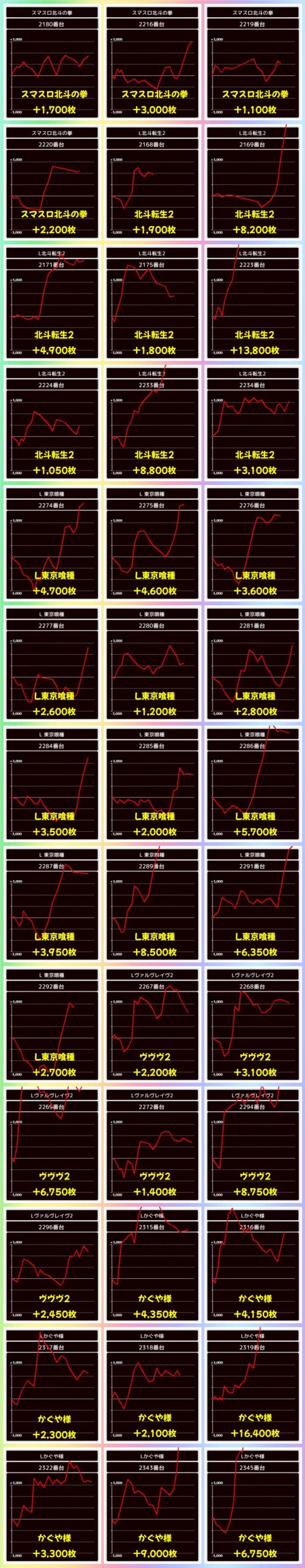 少台数かつ人気スマスロにも扱いの良い機種が多数あり!いずれも勝率は50%を超えており、からくりからは万枚台も!各機種3000枚クラスやそれ以上の台が確認できたので、各機種1台以上は高品質台があったのは間違いないでしょう!