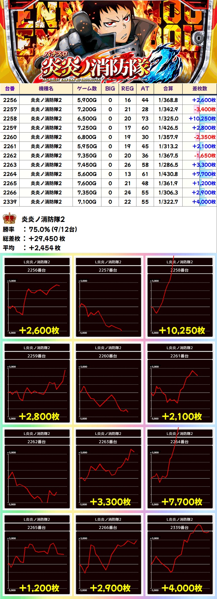 主力機種からは化物語と炎炎2が全台系濃厚でした!若干の不発台はあるものの、どちらも大量獲得台が数多くあり勝率も良し!