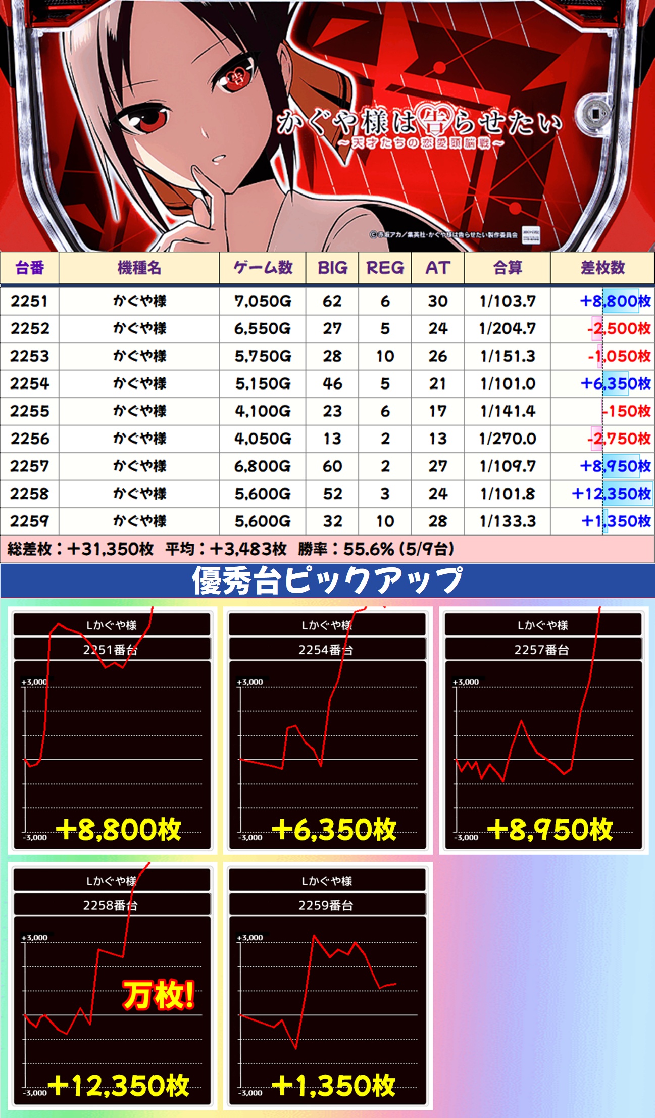 毎日オススメ機種には1/2系濃厚機種が複数あり、ヴヴヴ2が平均+2,000枚オーバー、かぐや様が平均+3,000枚オーバーと優秀。両機種ともに万枚突破台が出現しており、大いに盛り上がっていました。