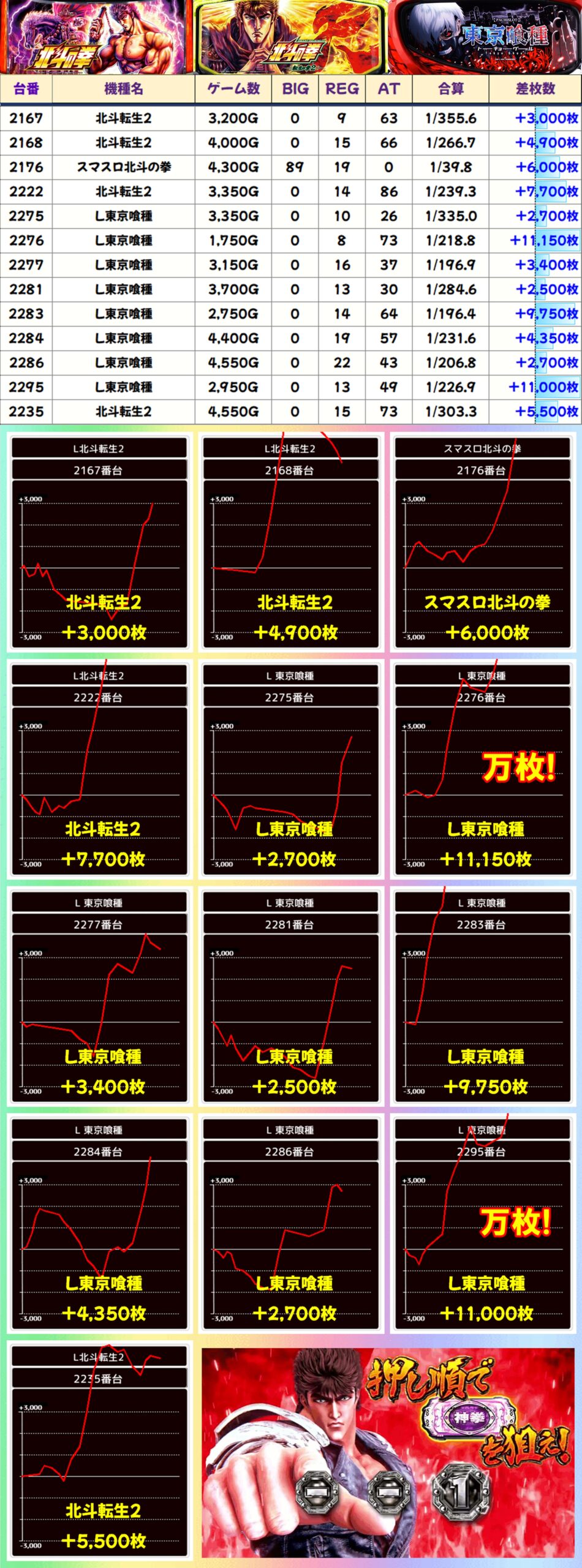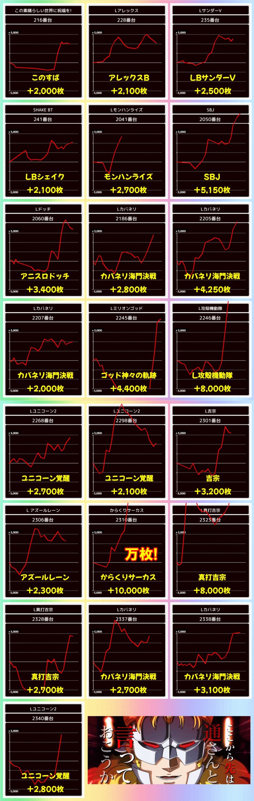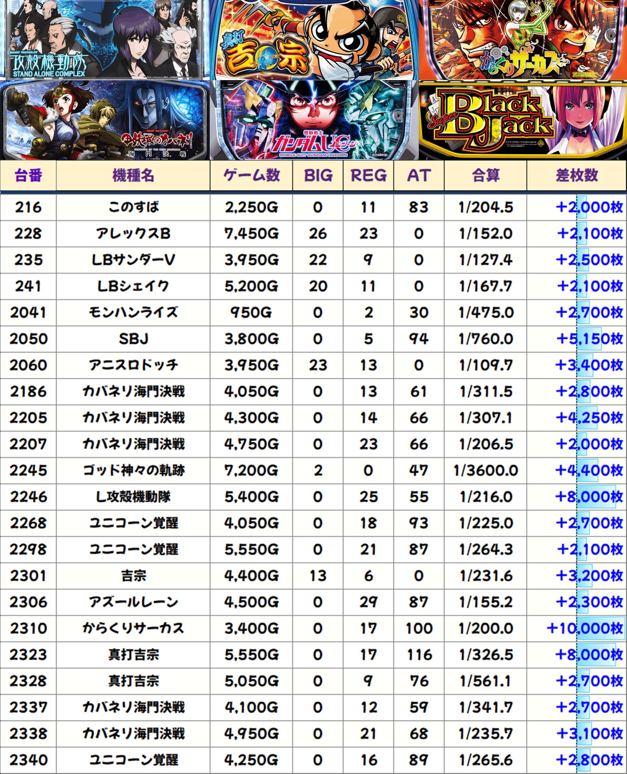 その他エリアからも単品の優秀台が続出。からくりサーカスに万枚突破台、真打吉宗から+8,000枚、SBJから+5,000枚オーバー台出現と、爆裂台も至るところで散見されました。