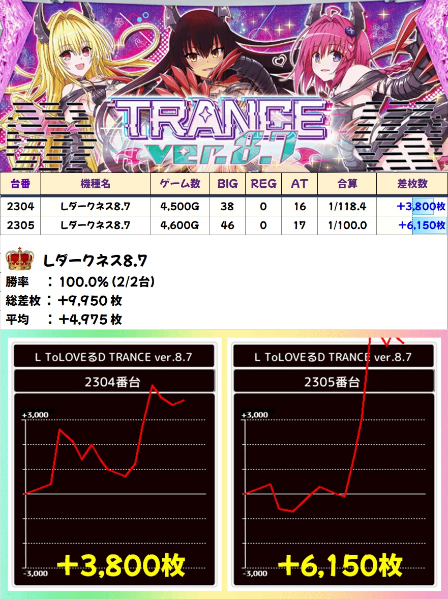 少台数機種では2台設置のLダークネス8.7が全台系濃厚で、平均+4,975枚と絶好調。2台とも投資は少なめで、2304番台が+3,000枚オーバー、2305番台が+6,000枚オーバーとガッツリ差枚をお持ち帰りしました。