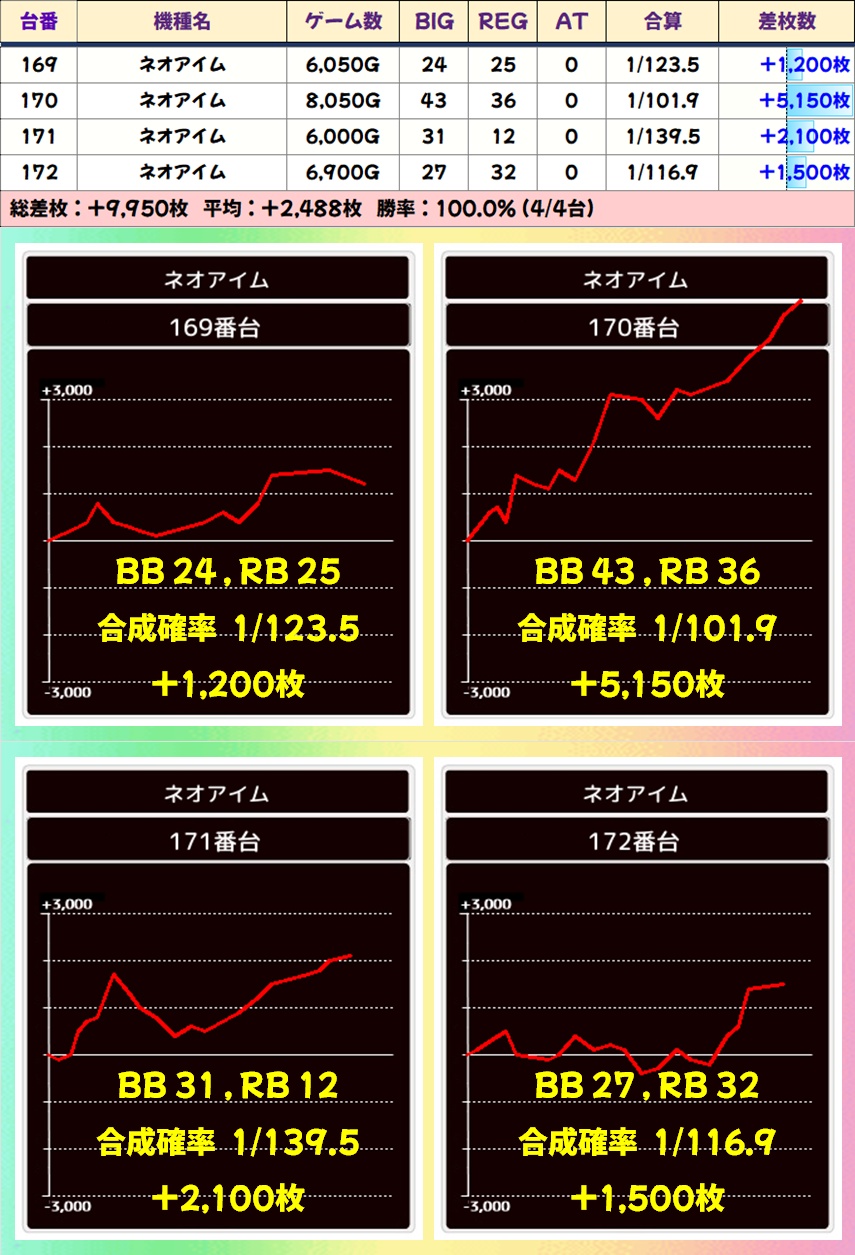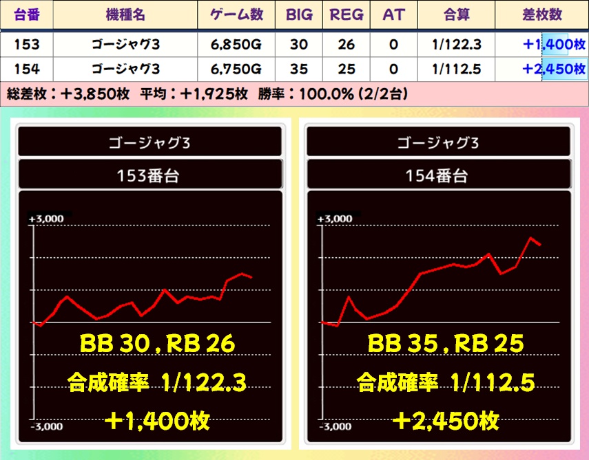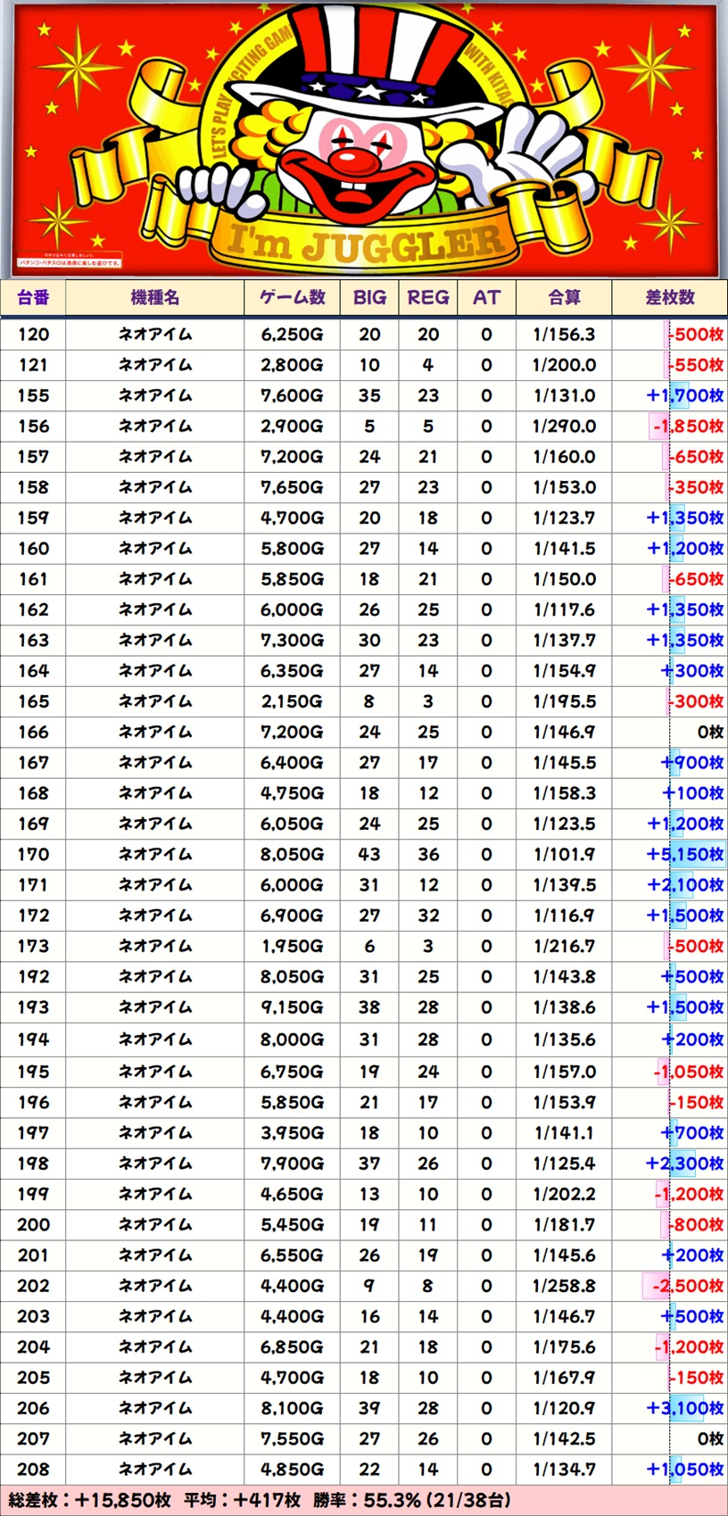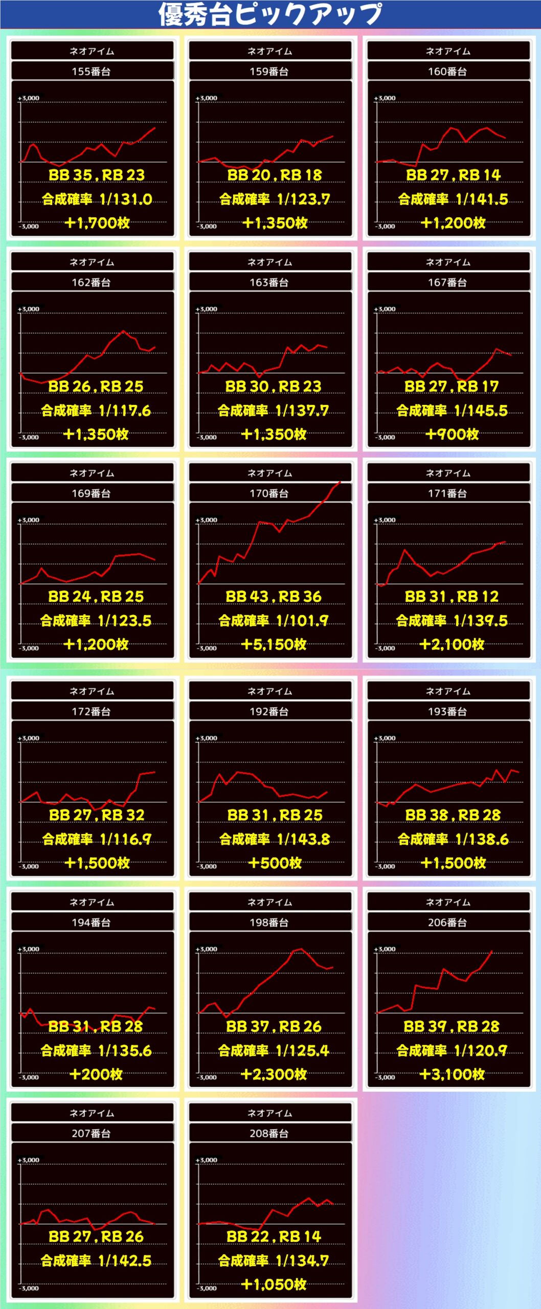 多台数機種だけでなく、少台数機種にも好調機種を確認。今回はハピジャグが1/2系濃厚で、平均+1,700枚という好成績を記録しました。多台数機種ではネオアイム・ゴージャグ3が高配分と思われる結果で、合算良好台が多数見受けられました。
