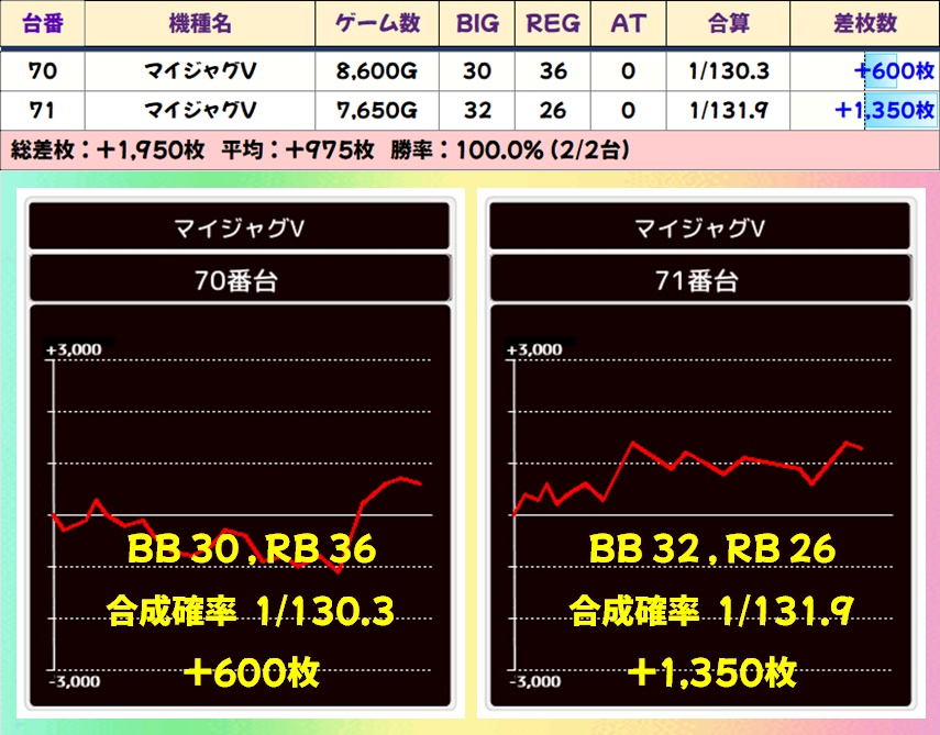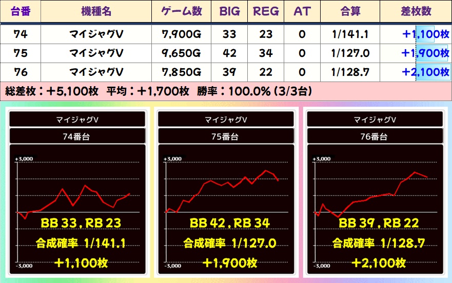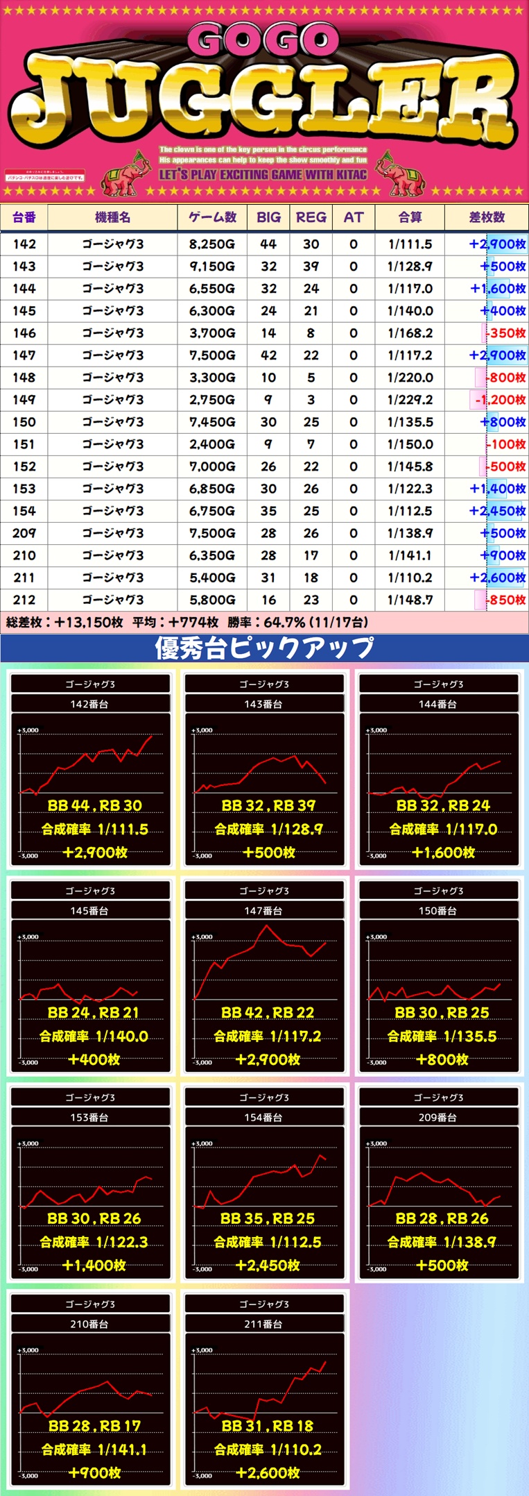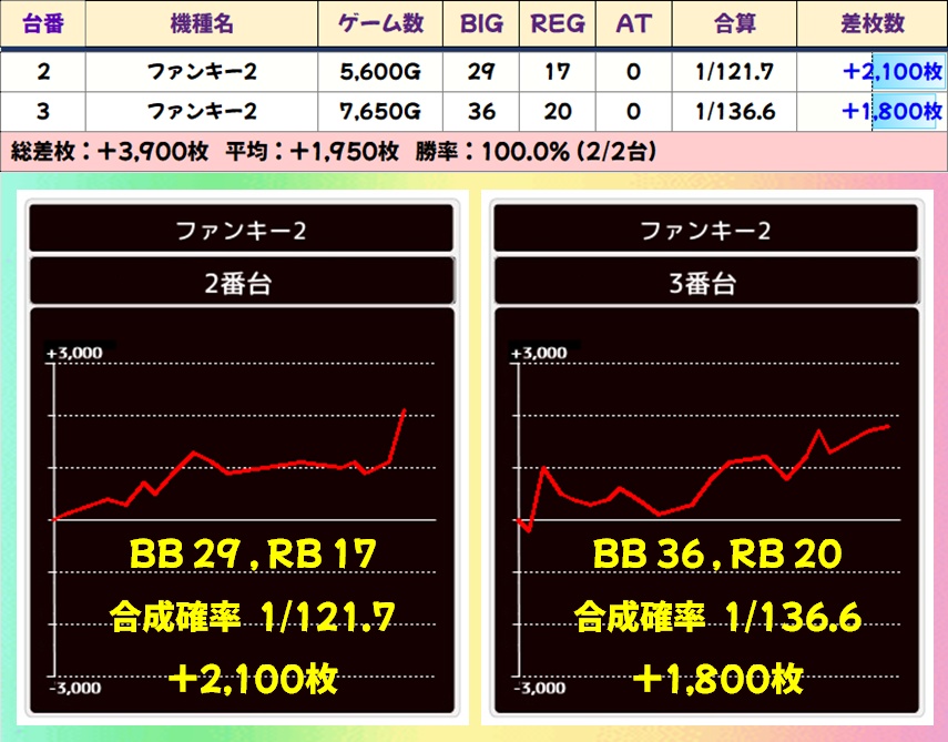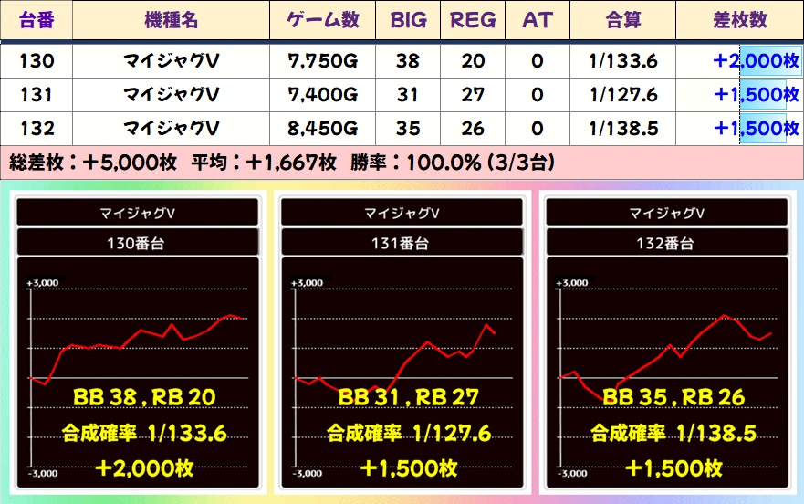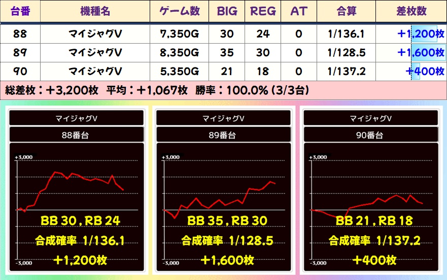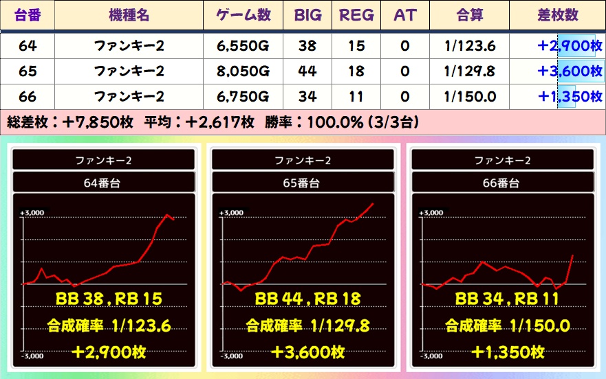 また、多台数機種は列や並び仕掛けも頻発傾向にあり、当日は高配分機種のネオアイム・ゴージャグ3以外にもマイジャグV・ファンキー2にも優秀並びが散見されました。ほかにも単品多数でシリーズ全体がお宝満載となっていたようです。