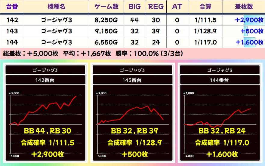 ノーマル・BT機からも+2,000枚オーバー台が複数確認できたほか、カバネリ海門決戦・ゴッド神々の軌跡・ユニコーン覚醒といった新しめの機種にも優秀台があり、今回もどこにでもチャンスがある状況でした。