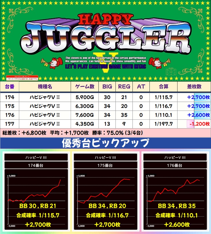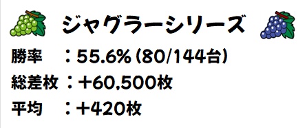 今回もジャグラーシリーズには高配分機種が複数あり、多台数機種には並びで出ている箇所も散見されました。全体の勝率は50%を上回っており、シリーズ総差枚は+6万枚と超優秀。7の日のジャグは鉄板で強いので、かなり狙い目ですよ!