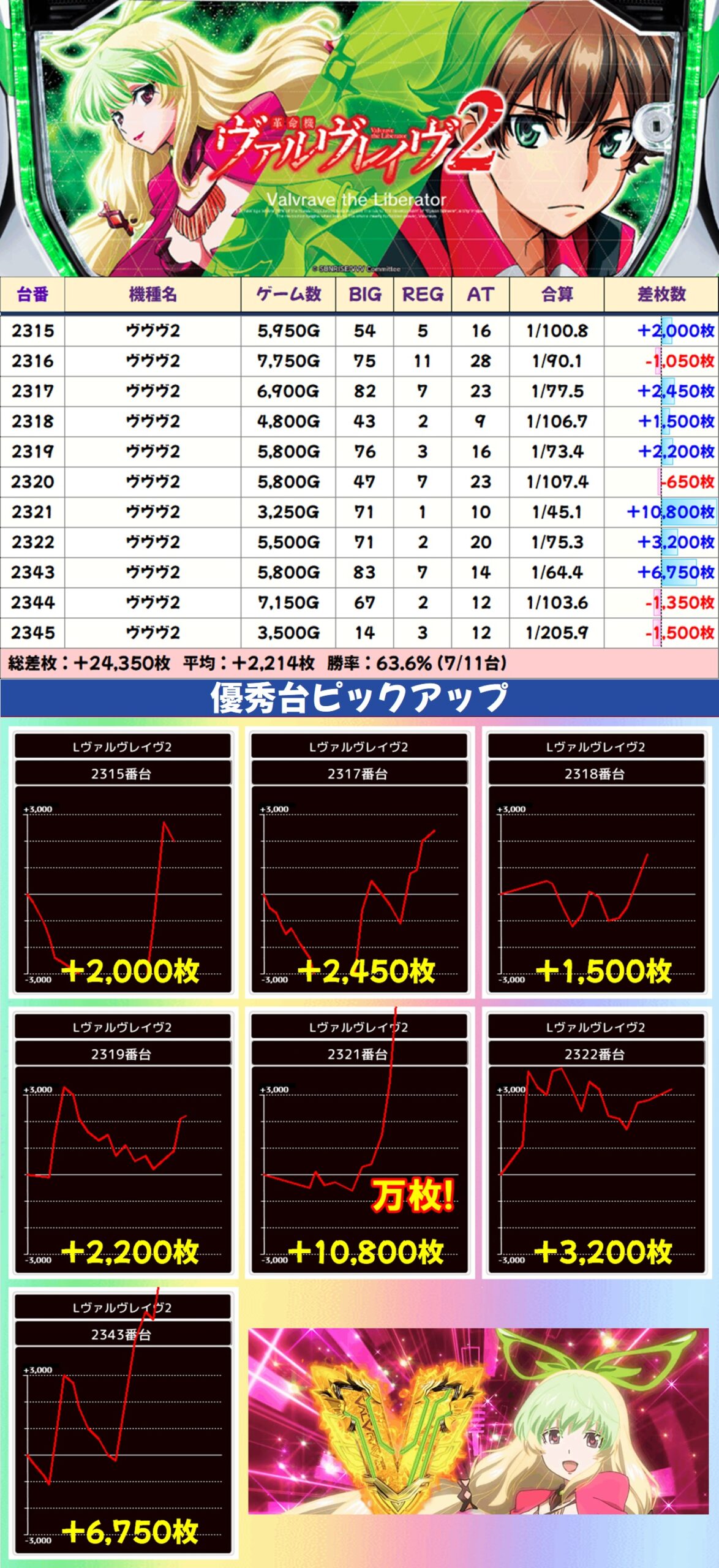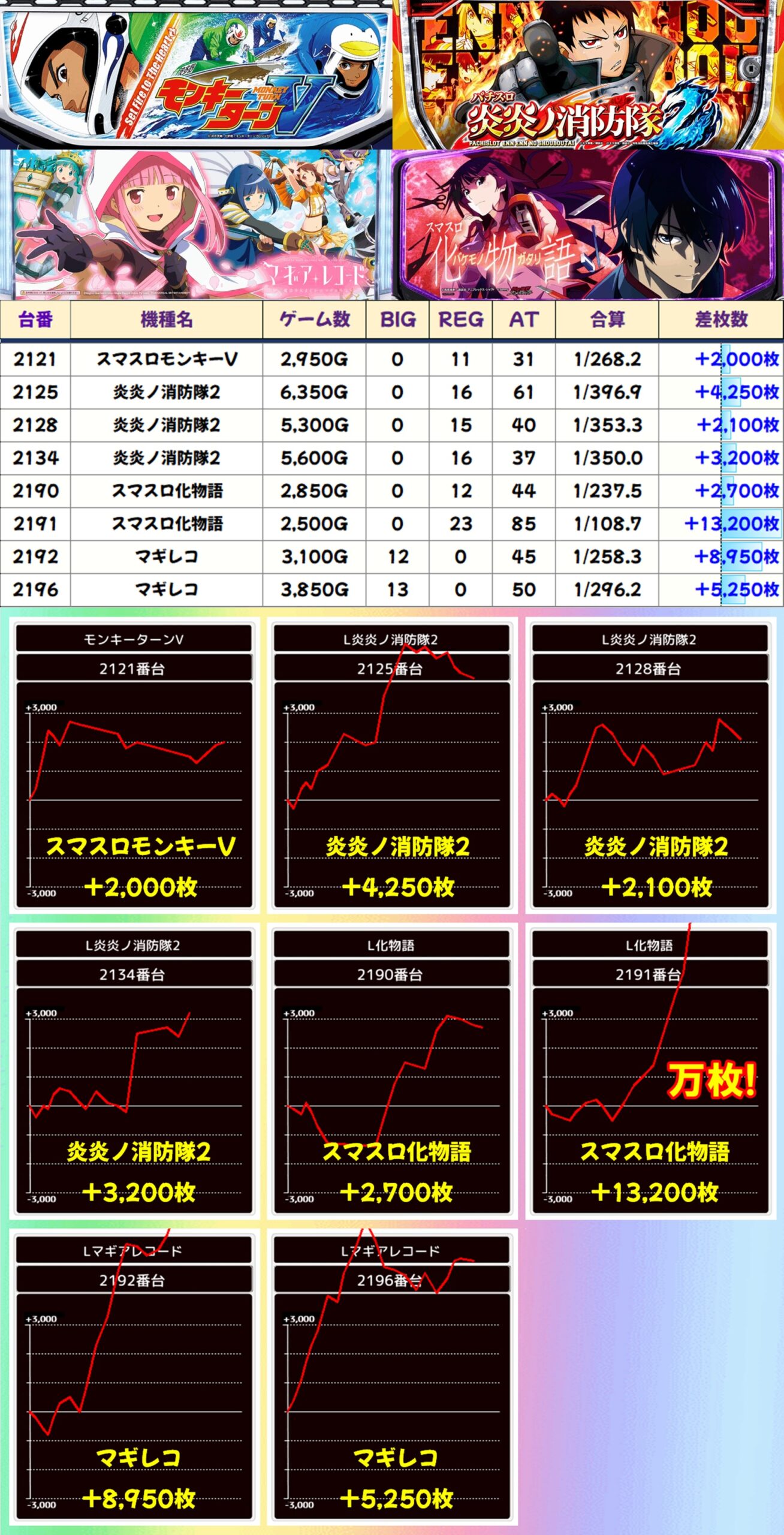 主力機も各機種に+2,000枚オーバーの優秀台を確認。化物語には万枚突破台があり、マギレコからは2台が+5,000枚オーバーと、こちらもお宝台が多めに用意されていた様子が窺えます。