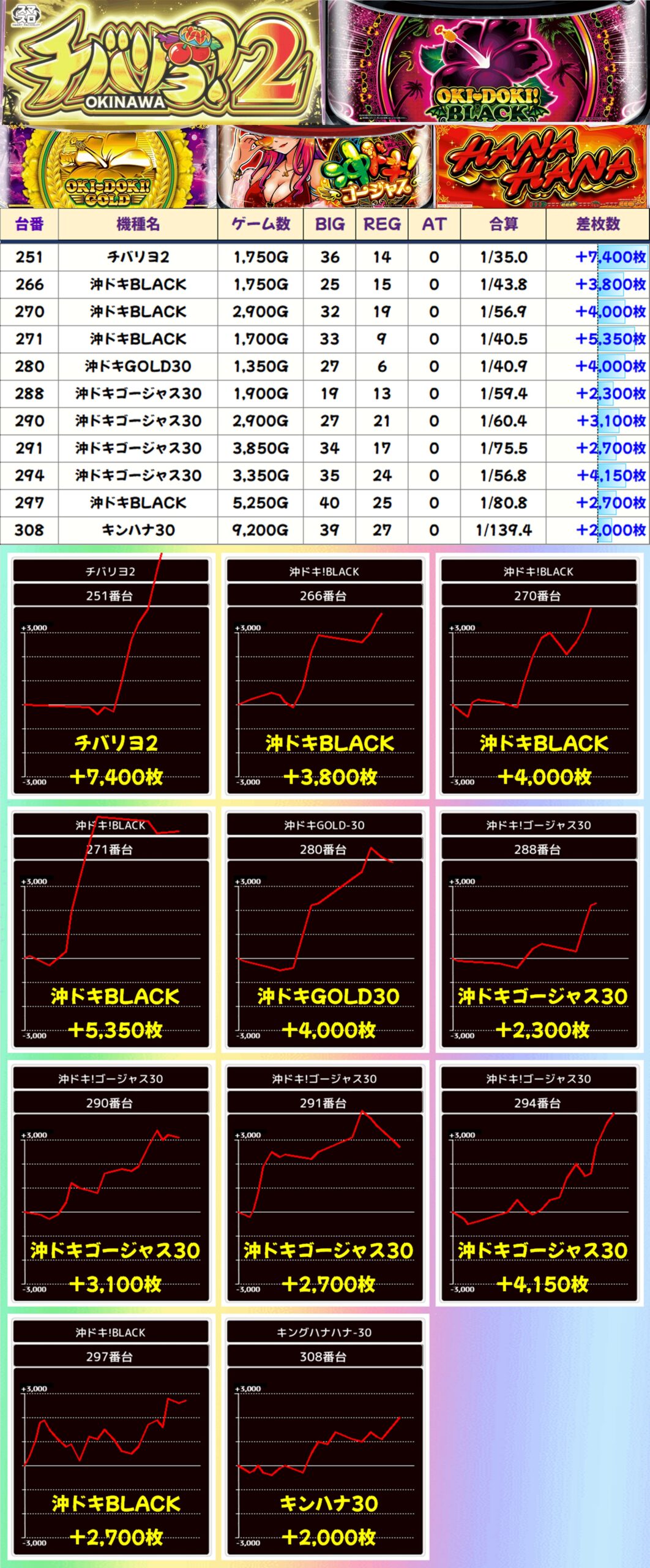 沖スロも様々な機種から大量出玉の優秀台が出現。増台した沖ドキBLACK・沖ドキゴージャスに+3,000枚オーバー台が複数あったほか、チバリヨ2に+7,000枚オーバー台があったりと、随所で賑わっていました。
