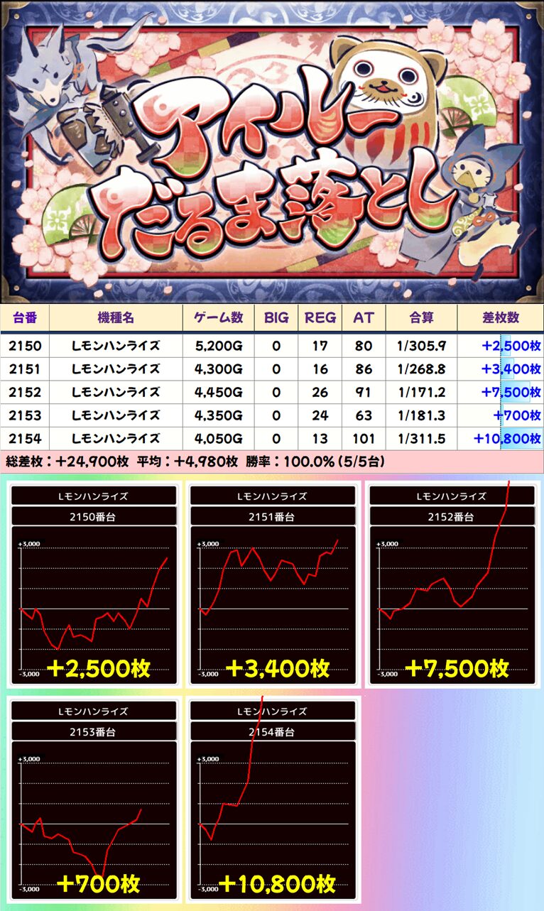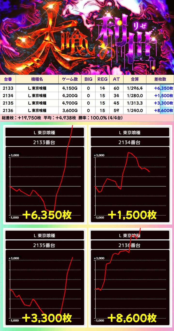 本日は平均+150枚と好結果を残しており、月イチ日らしい仕掛けが多数確認。天草応援団取材も開催されておりました。それでは本日の結果をまとめていきましょう!