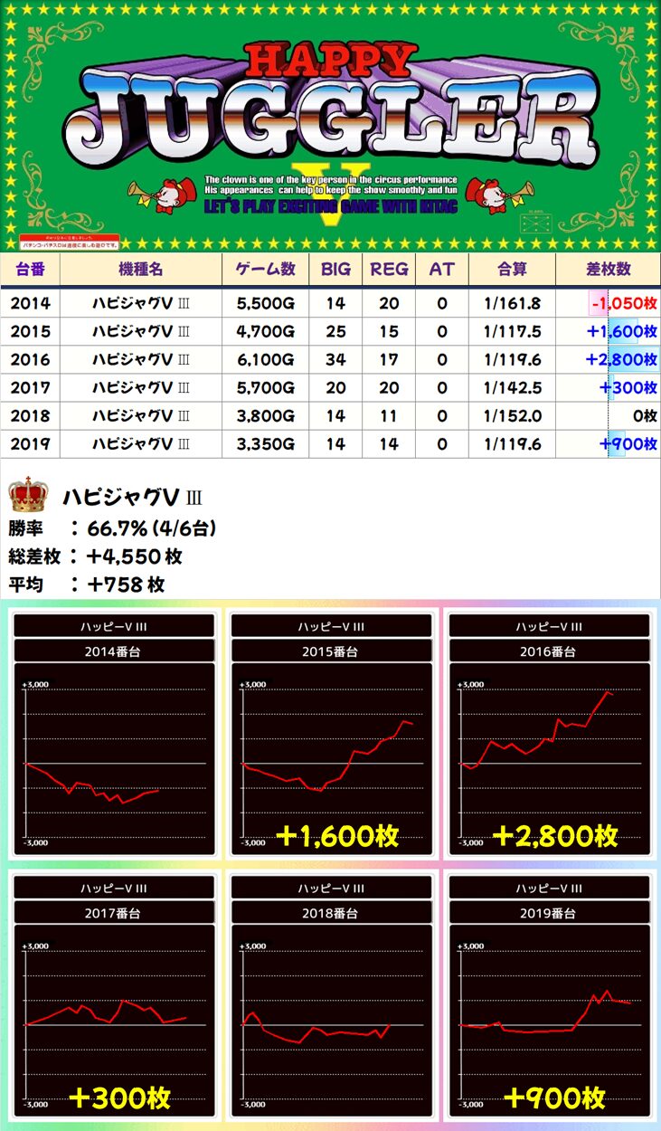 ハピジャグV Ⅲ (4/6台+) ➡平均 +758枚