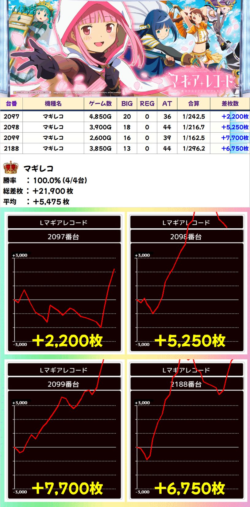 マギレコは全台大幅なプラスで平均5000枚超という素晴らしい結果に!人気機種にうれしい仕掛けが入ってくれました!