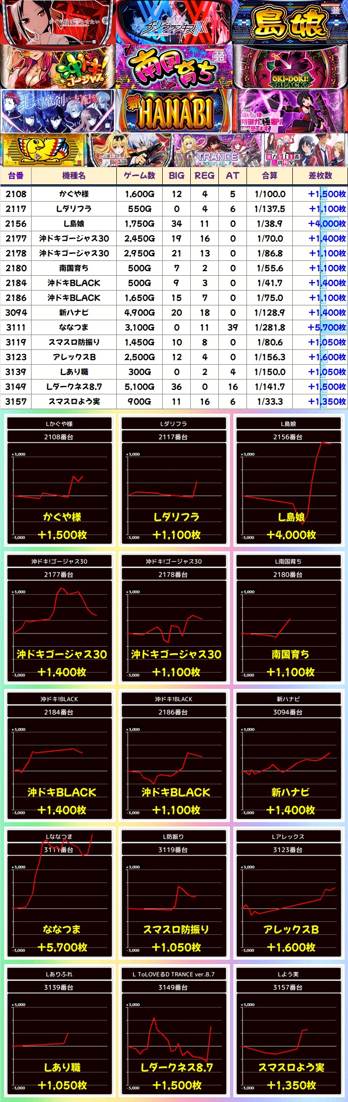 ほかにも各フロアに単品の優秀台が盛りだくさん。L島娘に+4,000枚、ななつまに+5,700枚の優秀台があったりと、少台数機種からも爆裂台が確認できました。