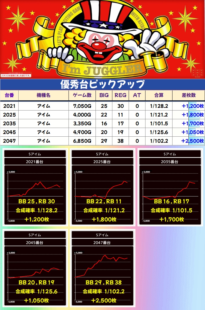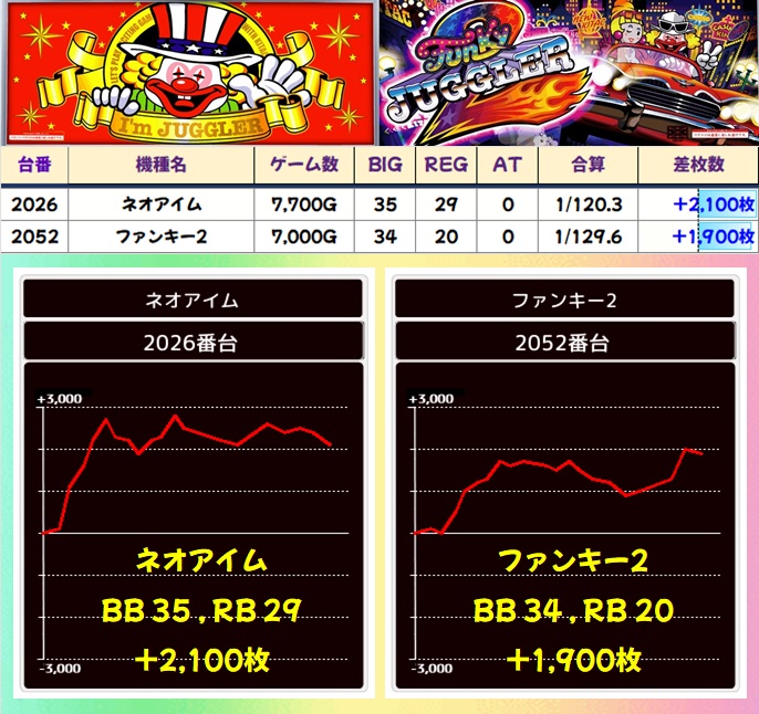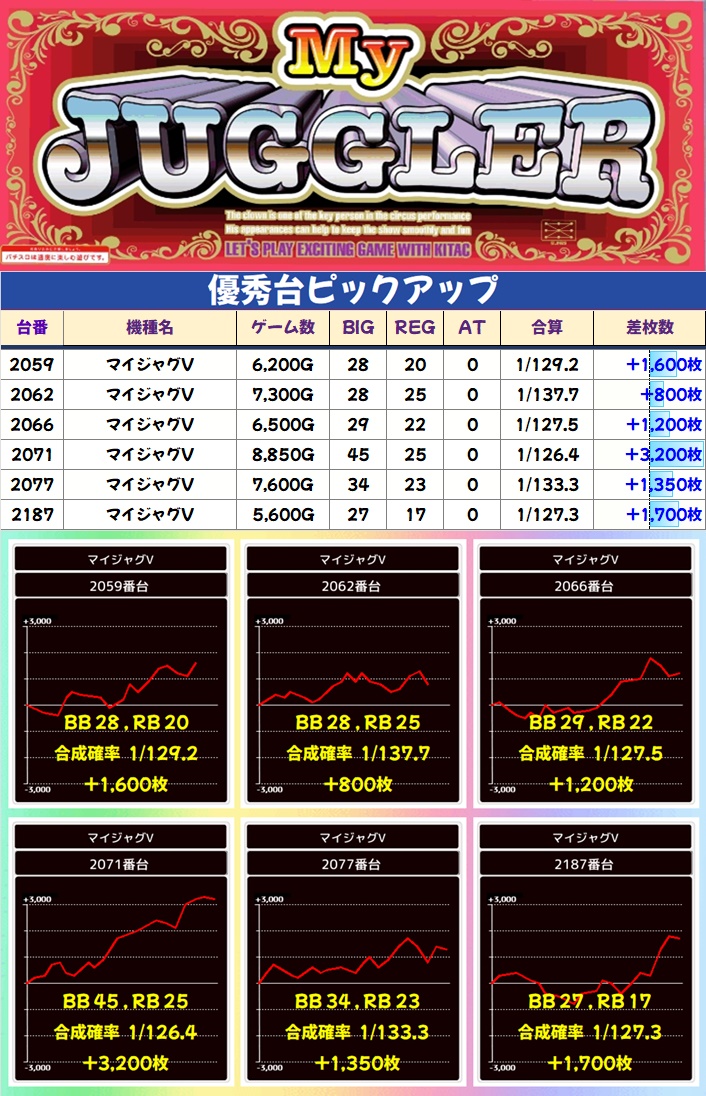 今回は20台が+2,000枚オーバーで、8台が+5000枚以上をお持ち帰り。主力機種やジャグラーといった毎回強めのエリアを中心に多くの優秀台が出現しました。