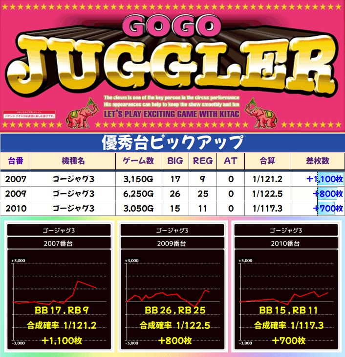 ジャグラーシリーズは台数の多いマイジャグV・アイム・ゴージャグ3に多くの優秀台を確認。特にマイジャグVとアイムは高配分になりやすく、今回もお宝が多めに用意されていたようです。そのほかにネオアイム・ファンキー2にも+2,000枚前後の優秀台があり、幅広くお宝が散りばめられていた様子が窺えます。