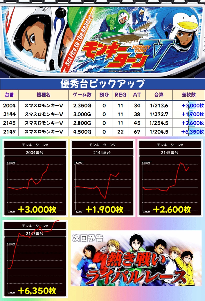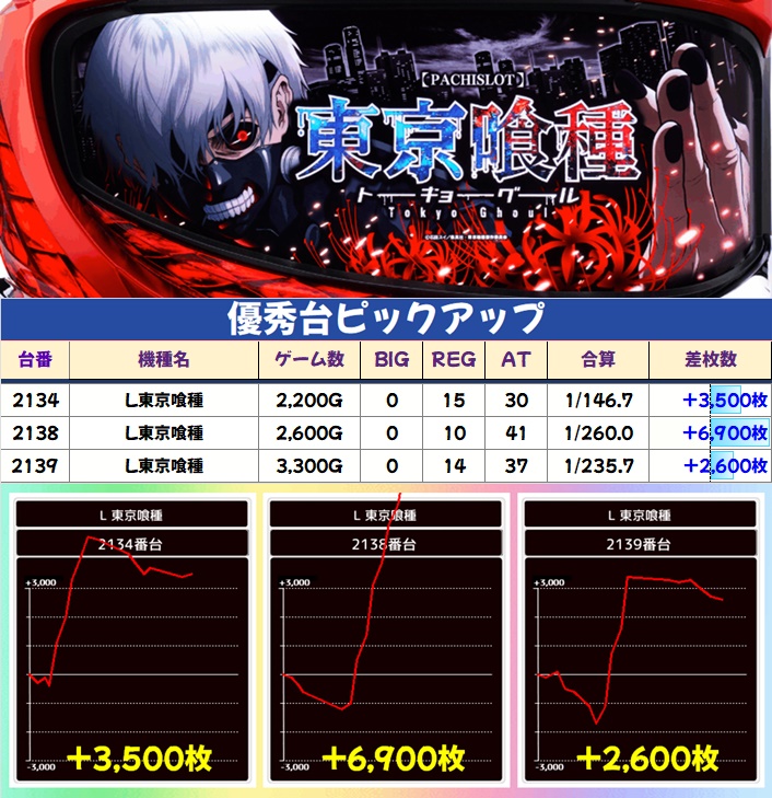 看板機種のモンキーV・東京喰種を含め、これらの主力機種には必ずといって良いレベルで当たりがあるので、今後も積極的に狙っていきましょう。