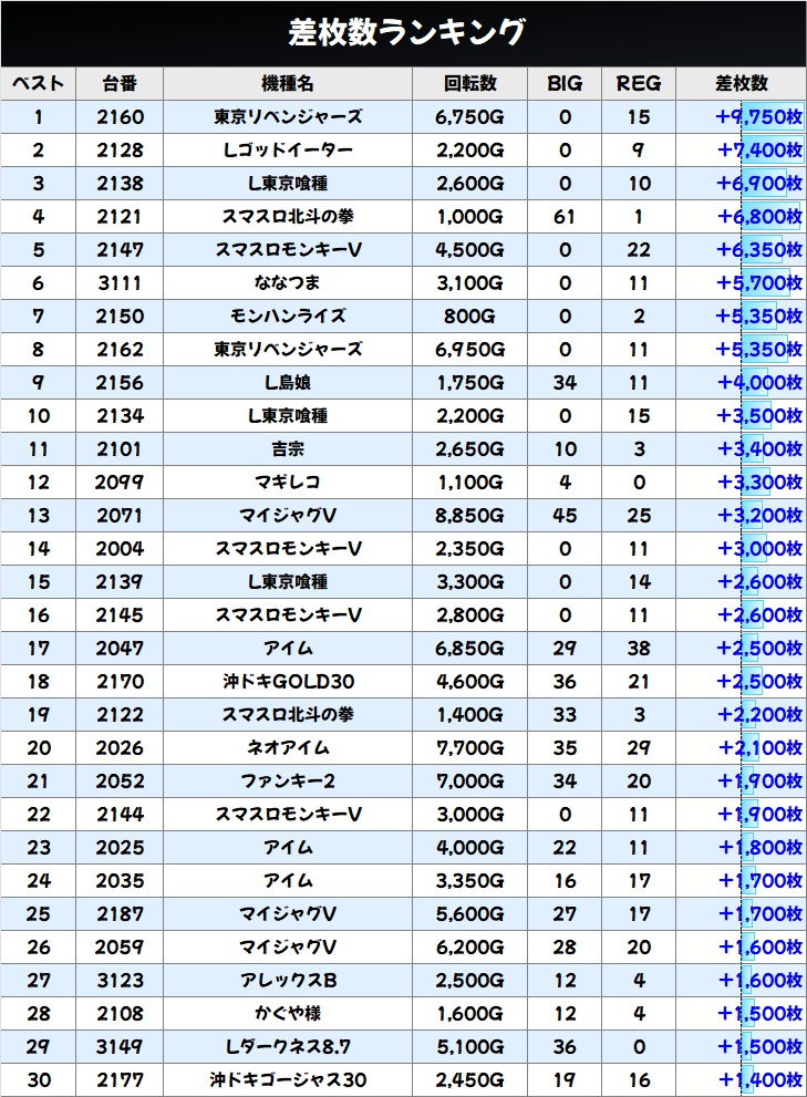 今回も看板機種のモンキーV・東京喰種は高配分と思われる結果。それぞれに+6,000枚以上の優秀台があったりと、しっかり盛り上がっていました。また、東京リベンジャーズも+9,000枚台、+5,000枚台の優秀台が出現し、平均差枚は約+1,000枚と優秀。こちらも主力として活躍していきそうな機種なので、今後の仕掛けにも期待できそうですね!