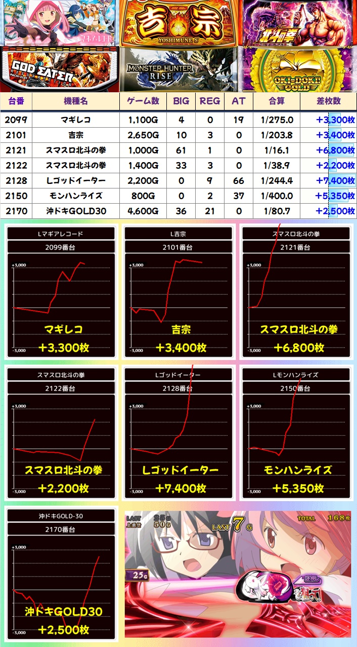 その他の主力機種にも優秀台を多数確認。沖ドキGOLDから+2,500枚、マギレコ・吉宗から+3,000枚オーバー、モンハンライズから+5,000枚オーバー、スマスロ北斗から+6,000枚オーバー、ゴッドイーターから+7,000枚オーバーと随所で盛り上がっていました。