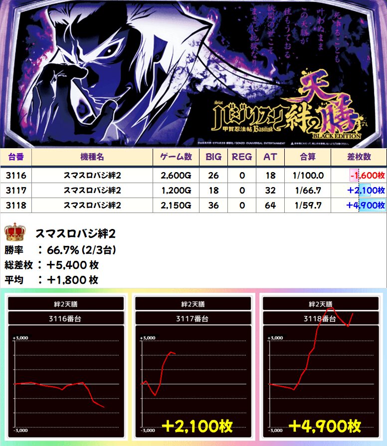 スマスロバジ絆2 (2/3台+) ➡平均 +1,800枚