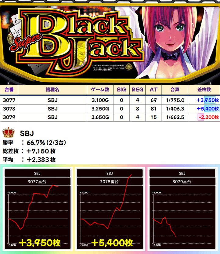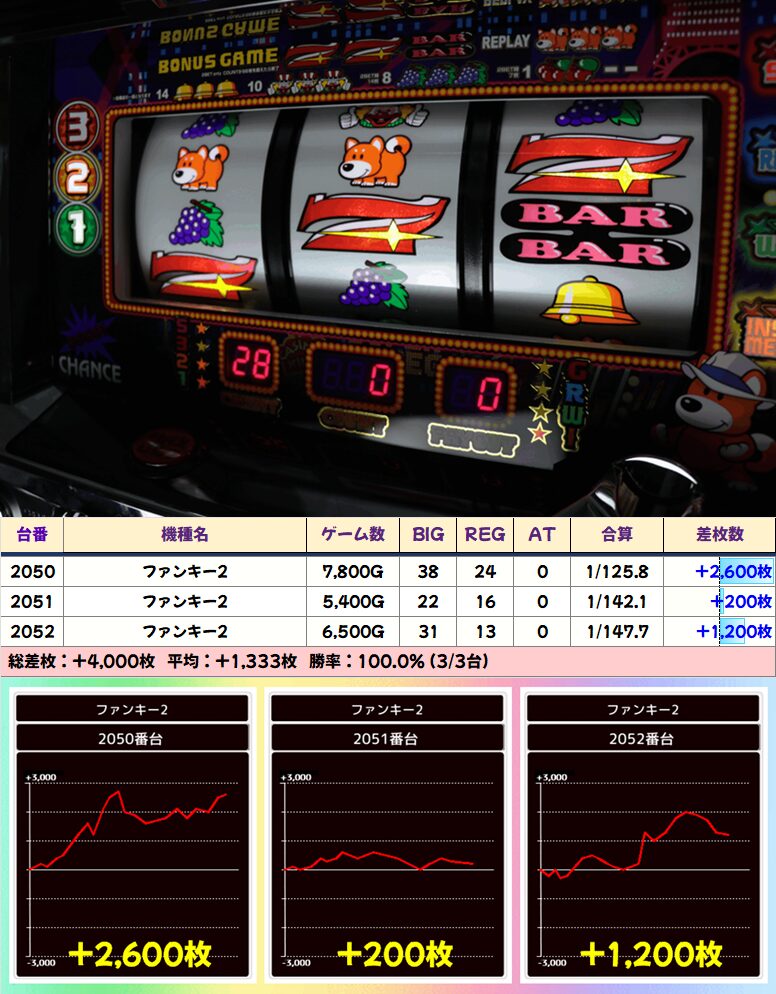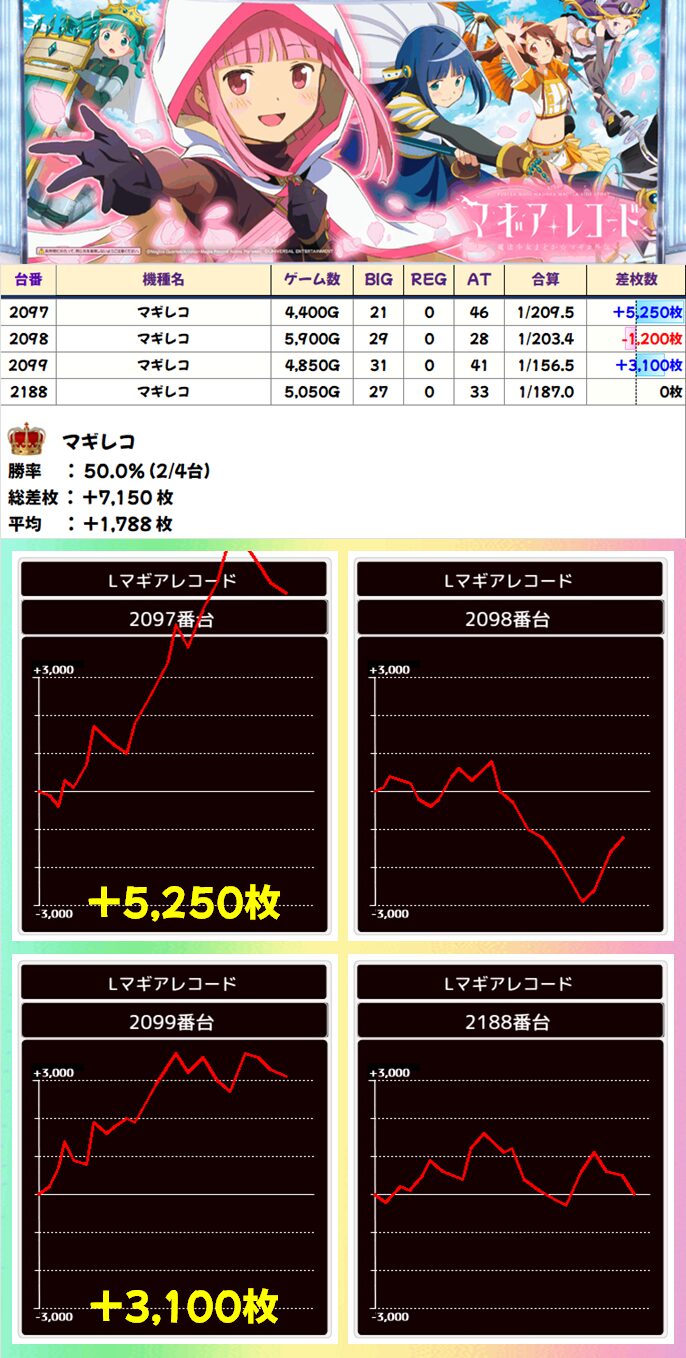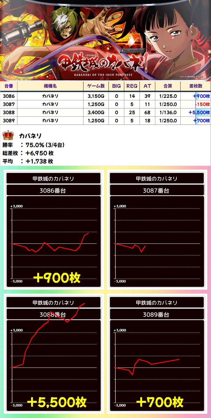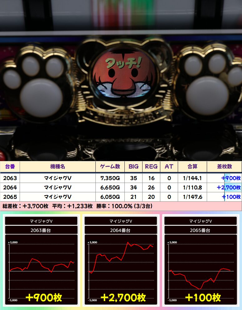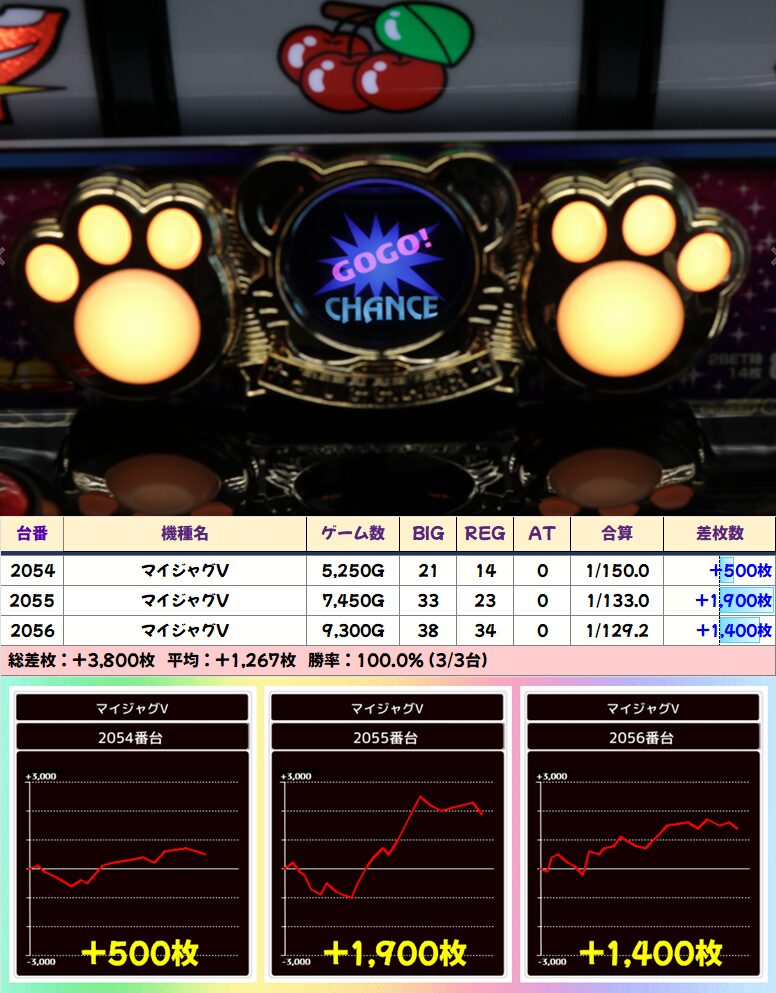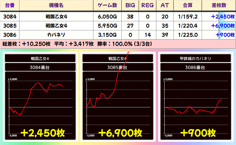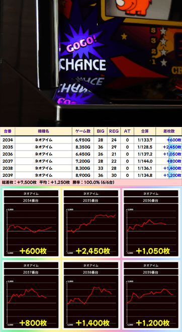 今回、全台系とみられる機種は上記の3機種。中にはやや伸び悩んだ台も見られましたが、いずれも平均差枚では優秀な数値を記録!稼働不足の台はもったいなかったか!?