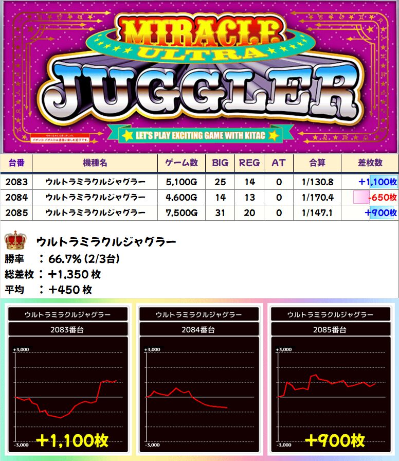 ウルトラミラクルジャグラー (2/3台+) ➡平均 +450枚
