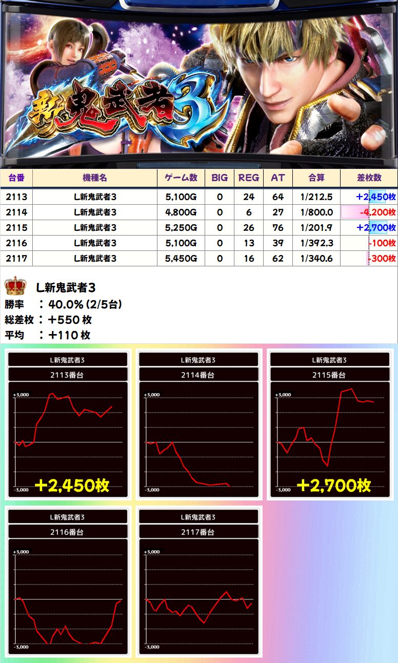 L新鬼武者3 (2/5台+) ➡平均 +110枚