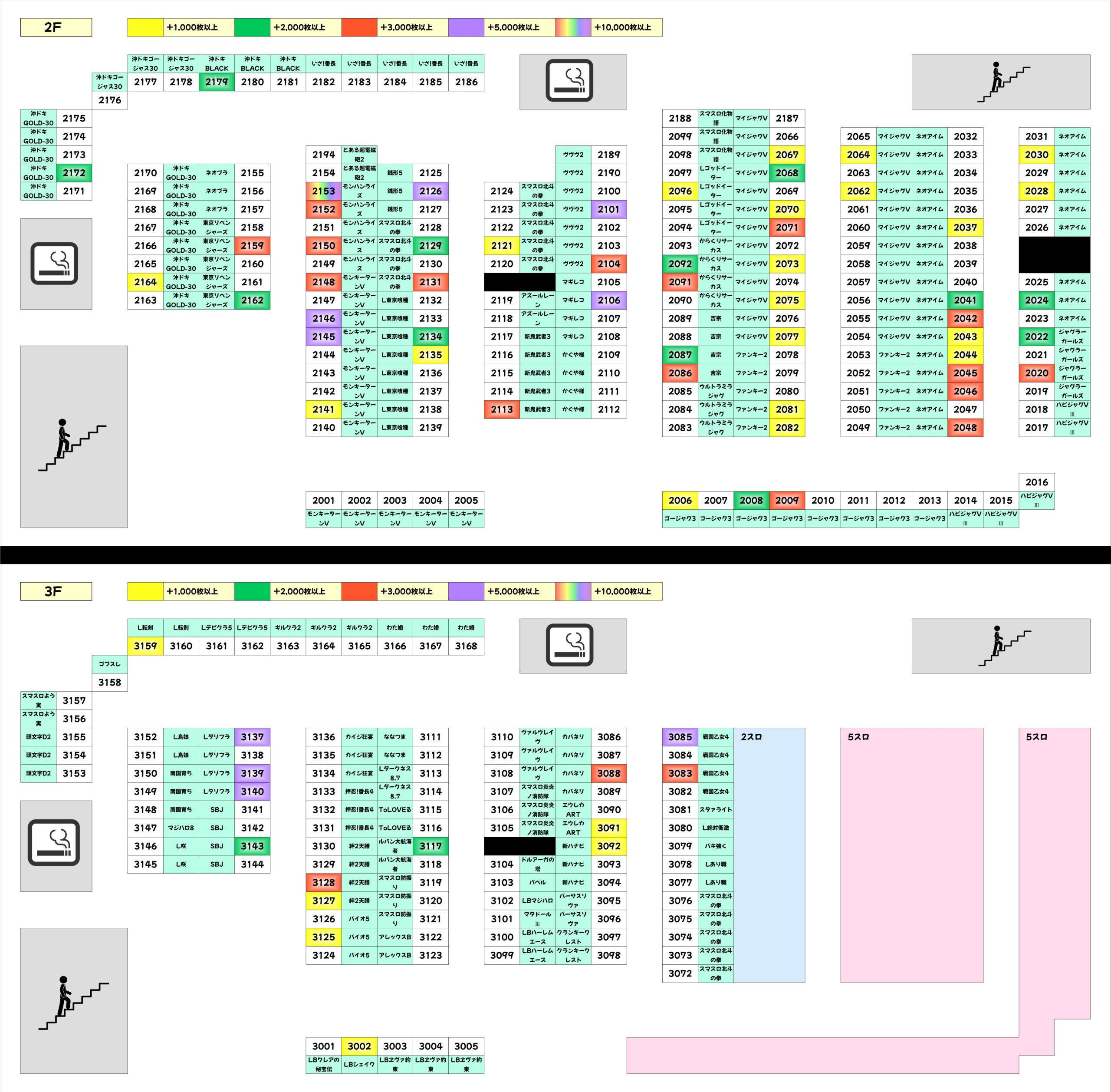 今回は4~5台設置機種に全台系と思われる優秀機種が3機種ありました。2Fはモンハンライズが平均+4,000枚オーバーの好成績で、万枚突破台も確認。3FはLダリフラが平均+4,000枚オーバー、戦国乙女が平均+2,000枚オーバーと優秀で、どの機種からも大量出玉の爆裂台が散見されました。