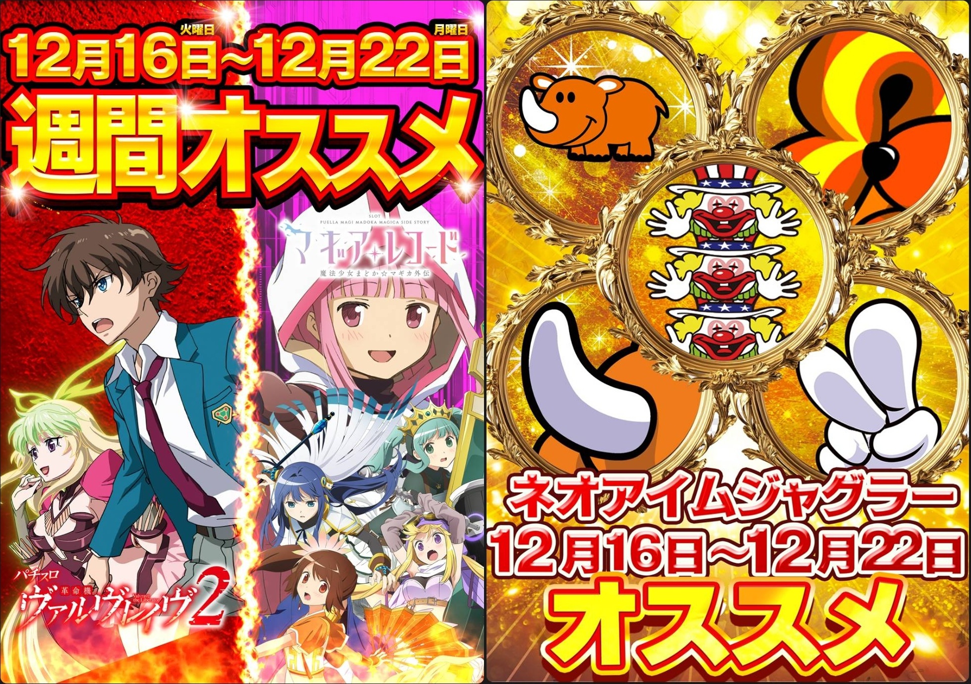 12/16~12/22の週間オススメ機種になっているヴヴヴ2・マギレコ・ネオアイムもそれぞれにお宝台が確認できました。ネオアイムはポスターの画像で仕掛けが示唆されている模様で、毎日いずれかの仕掛けが出現。今回は3連ピエロ→3台並びの仕掛けが盛り込まれていたようです。
