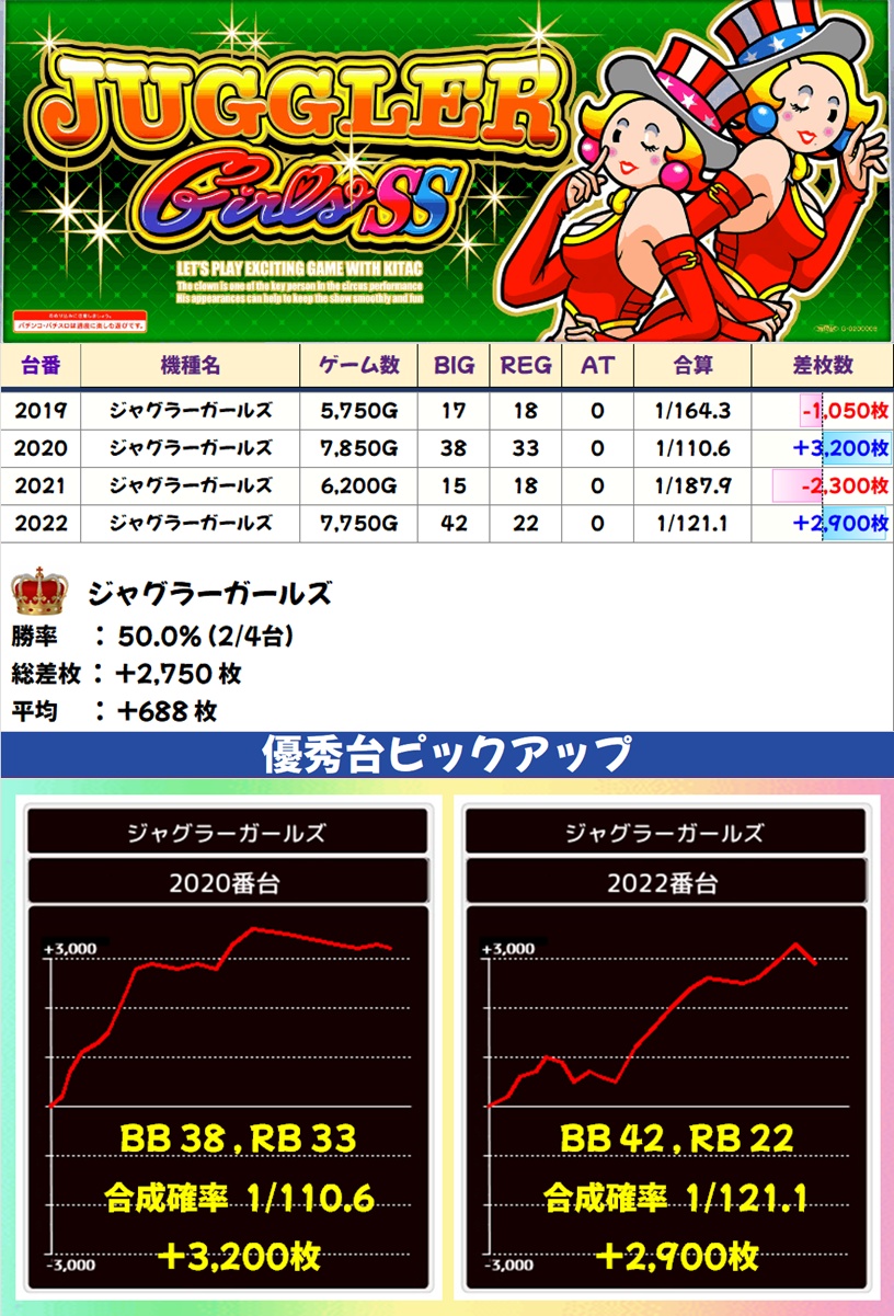 ジャグラーガールズ(2/4台+) ➡平均 +688枚
