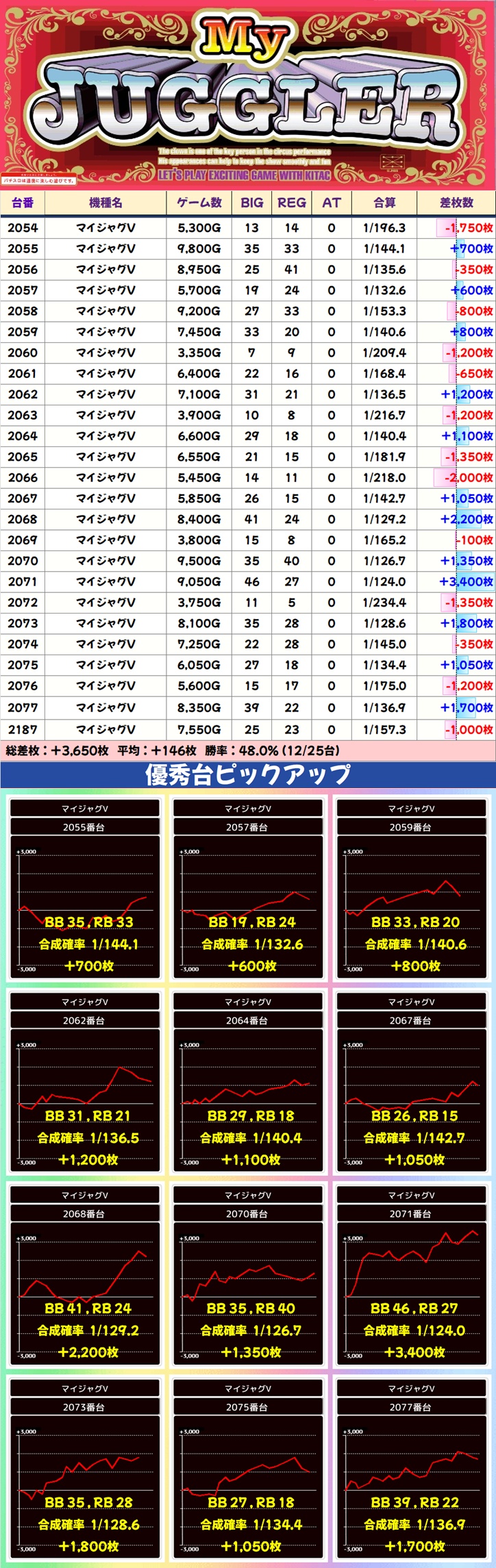 ご覧の通り、この日の結果は総差枚+35,050枚、台平均+118枚としっかりプラスに。定番の全台系&1/2系濃厚機種が多数出現したほか、高配分・並びといった多彩な仕掛けが散見されました。