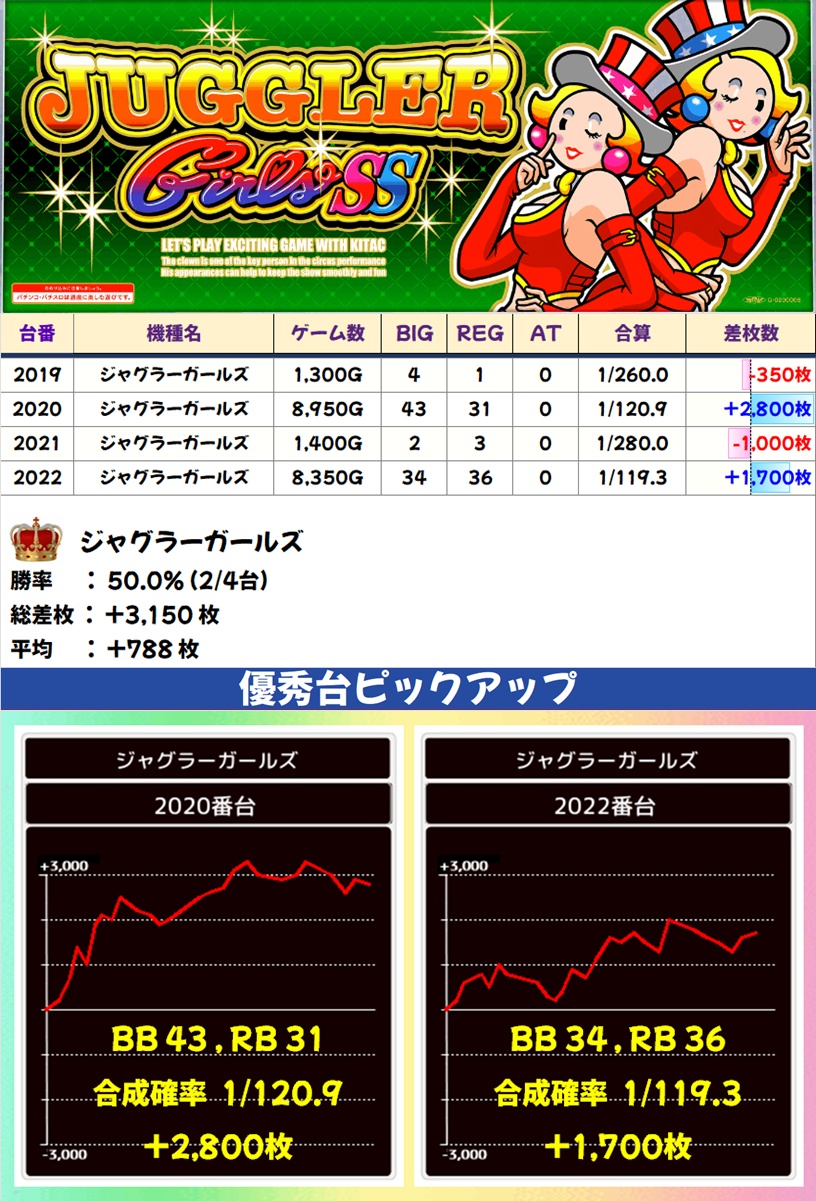 ジャグラーガールズ(2/4台+) ➡平均 +788枚