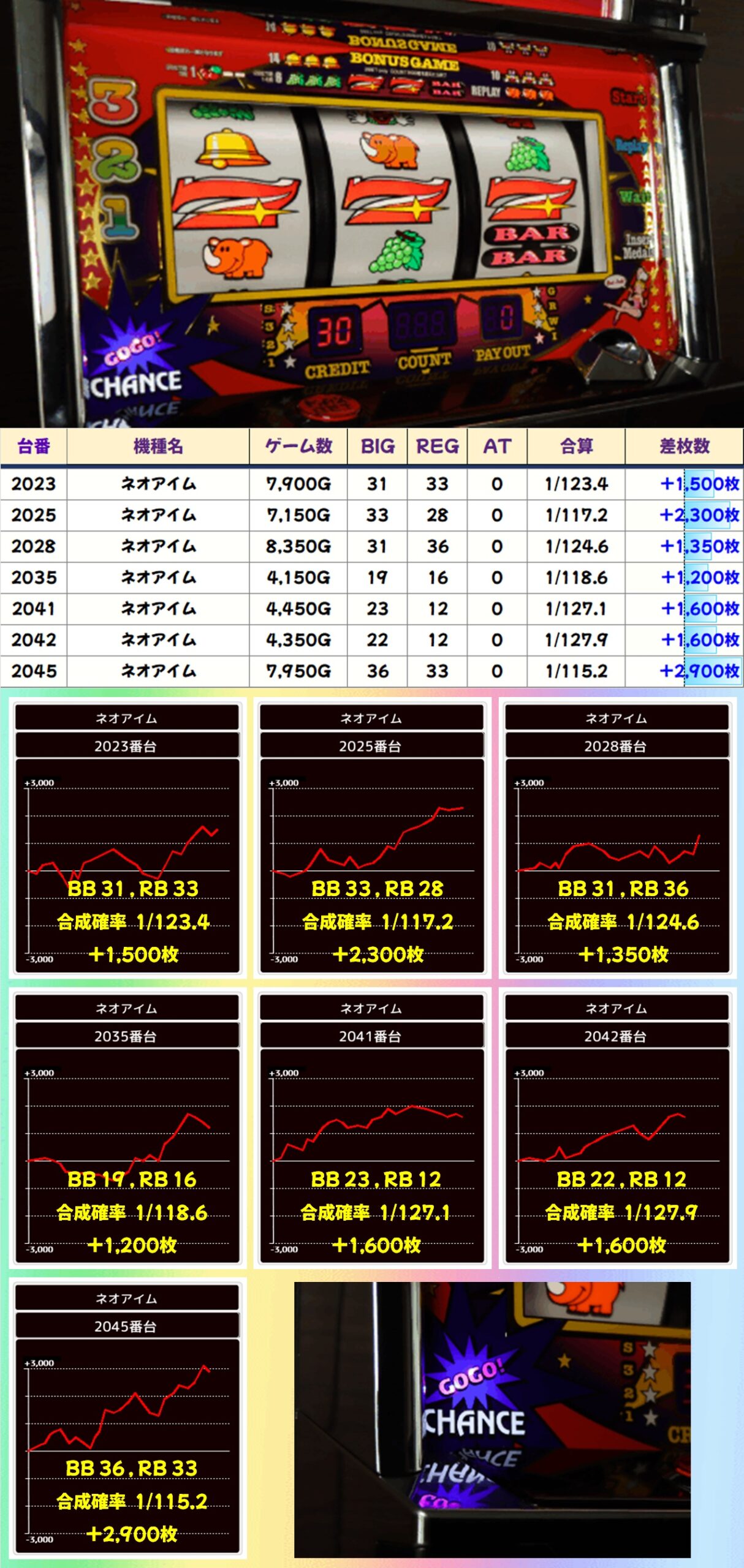 ネオアイムは2029~2031番台が並びで出ており、平均+1,500枚オーバーの好成績を記録。BIG・REGともに優秀で、質も最高クラスになっていたのではないかと思われます。ほかにも+1,000枚以上をお持ち帰りした台が7台あり、全体的に見ても高配分だったのではないでしょうか。