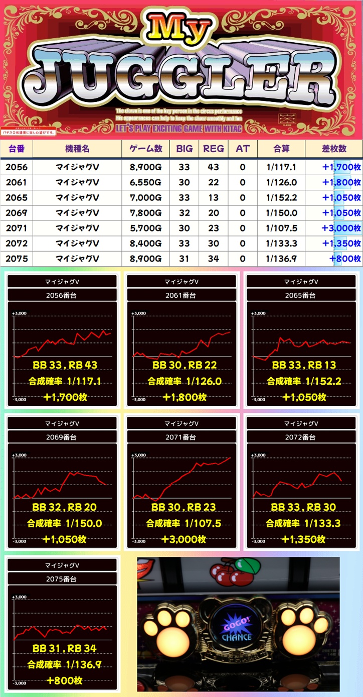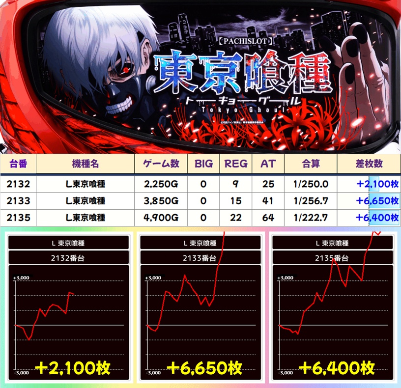 毎日オススメ機種はそれぞれに優秀台を複数確認。モンキーV・東京喰種には+6,000枚オーバー台が2台ずつあり、マイジャグにも+3,000枚お持ち帰りした台があったりと、当たりと思われる台がしっかり用意されていました。