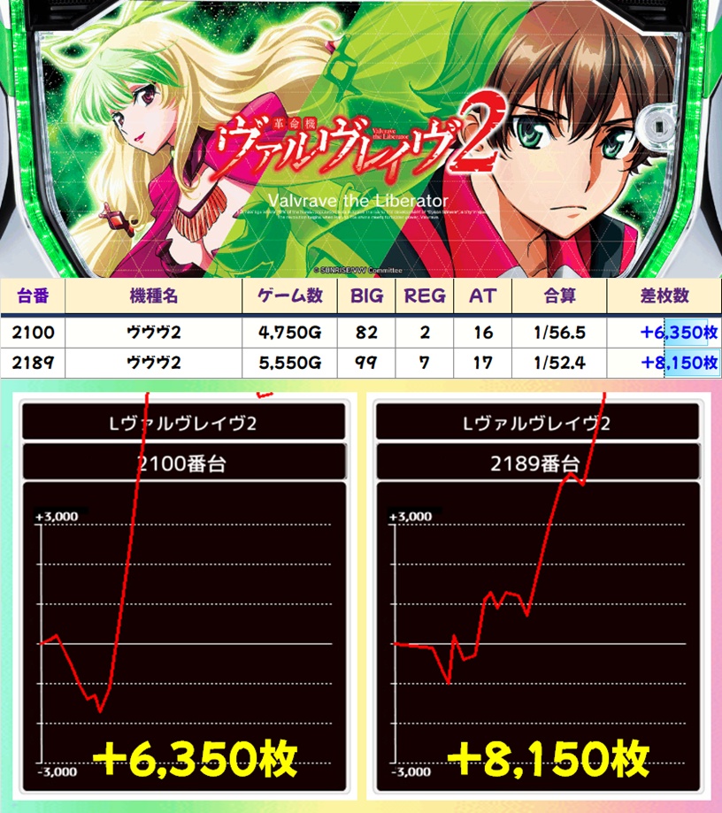 ネオアイム以外ではヴヴヴ2から+6,000枚台、+8,000枚台の優秀台が出現。Lゴッドイーターは不発だったようですが、オススメ機種は普段より期待できる状況になっているので、期間中は積極的に狙っていきましょう。