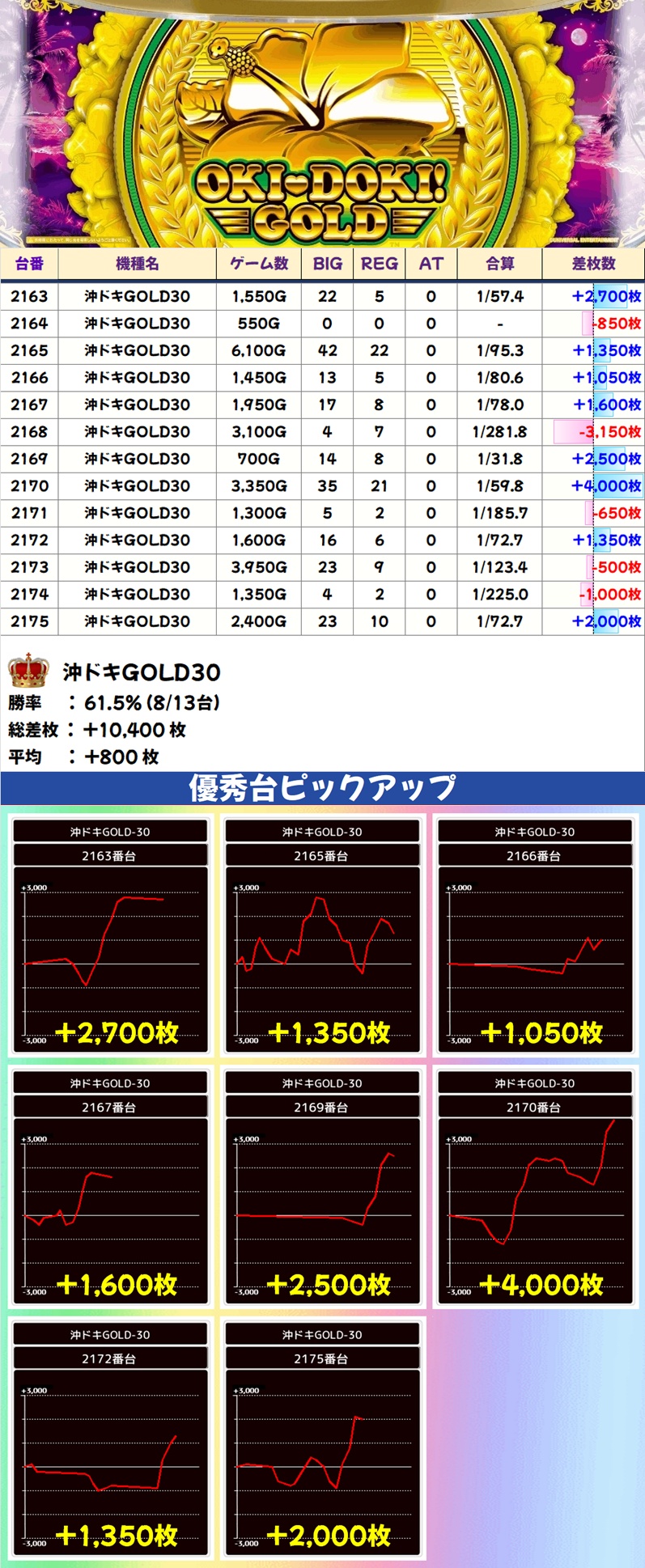 沖ドキGOLD30(8/13台+) ➡平均 +800枚