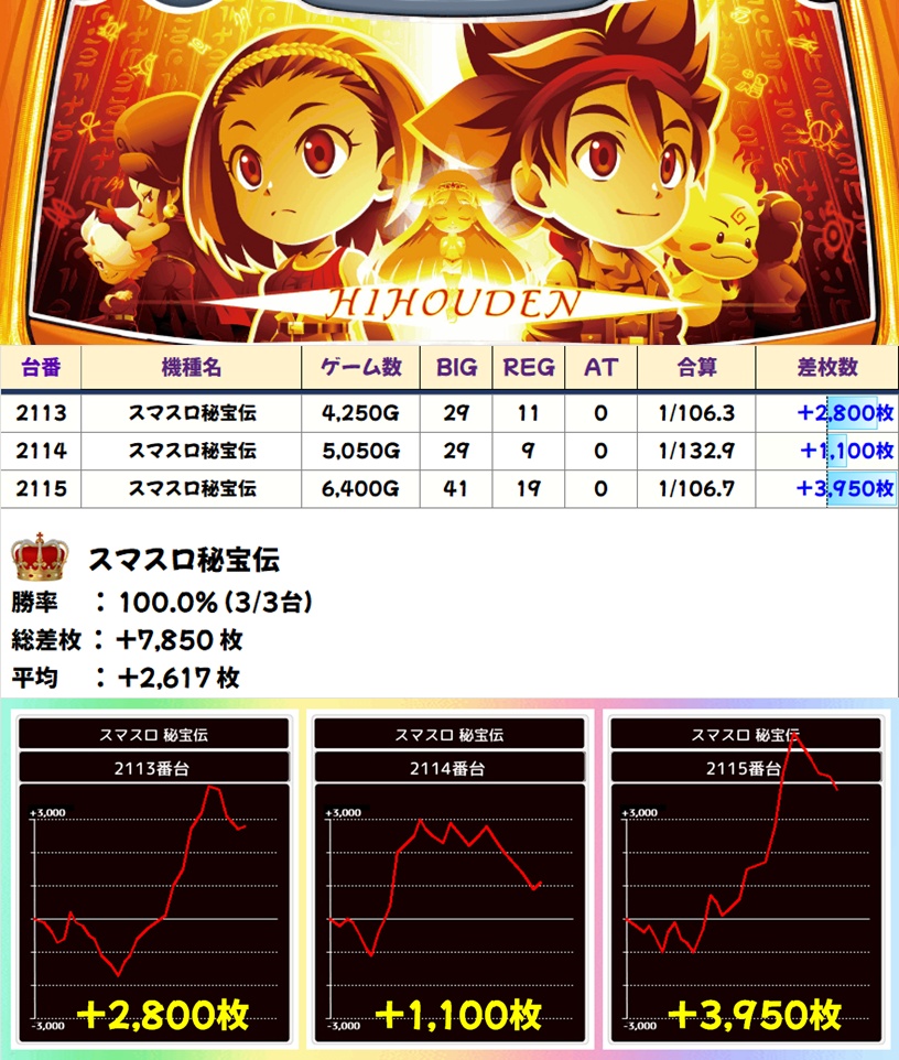 スマスロ秘宝伝(3/3台+) ➡平均 +2,617枚