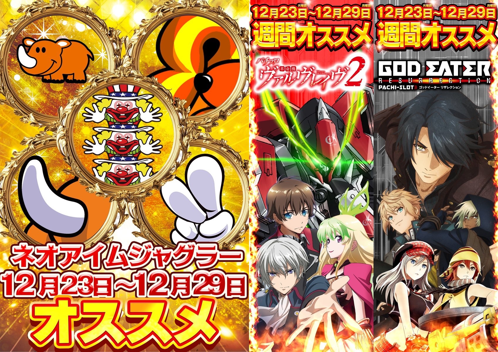 12/23~12/29はネオアイム・Lゴッドイーター・ヴヴヴ2が週間オススメ機種となっており、毎日オススメ機種とどうようにこの3機種は連日のお宝投入に期待できます。ネオアイムはポスターの画像で仕掛けが示唆されている模様で、毎日いずれかの仕掛けが用意されているようです。示唆内容は下記の通り。