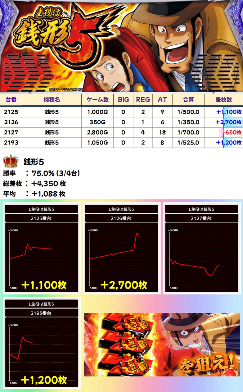 銭形5(3/4台+) ➡平均 +1,088枚