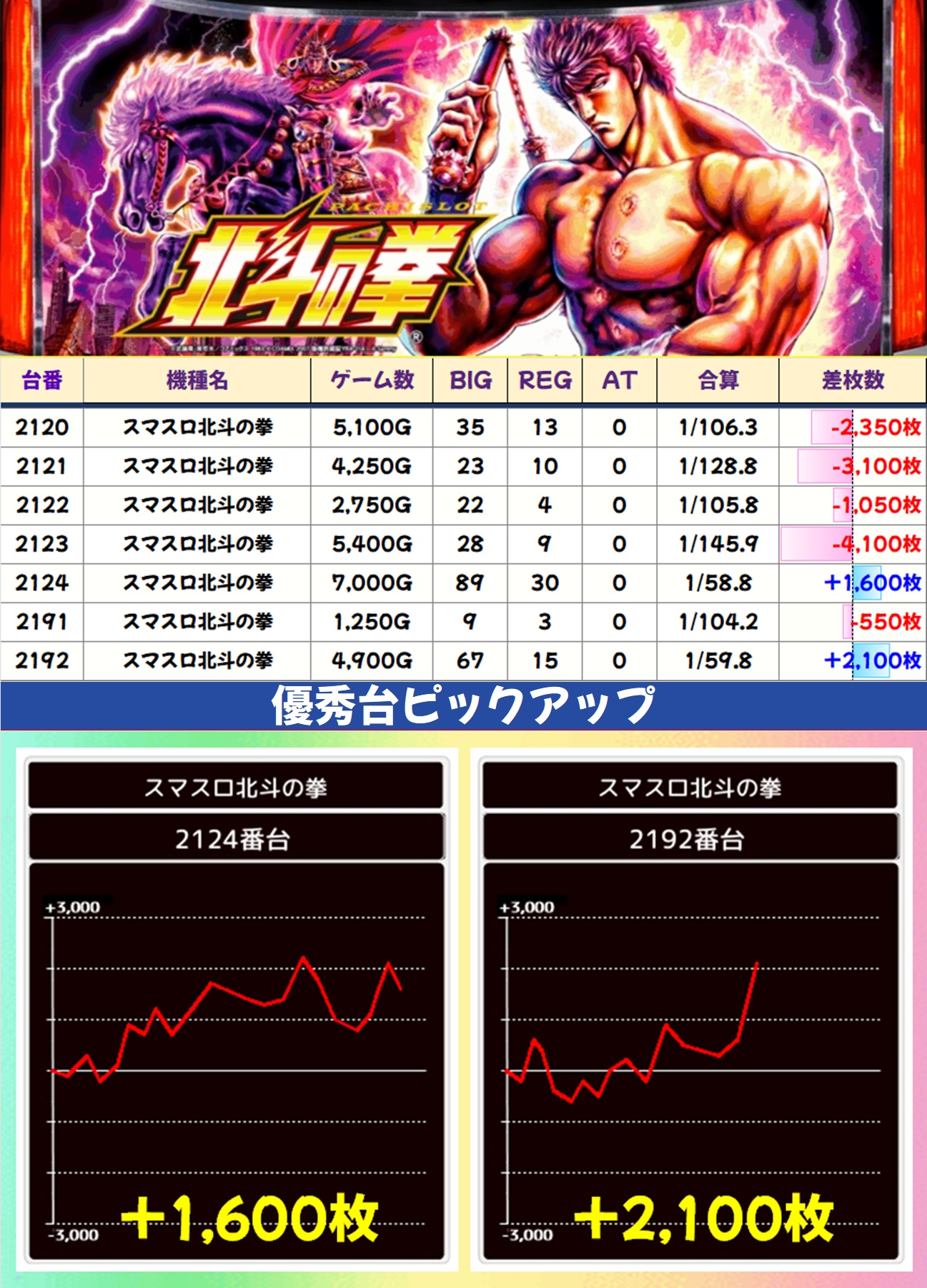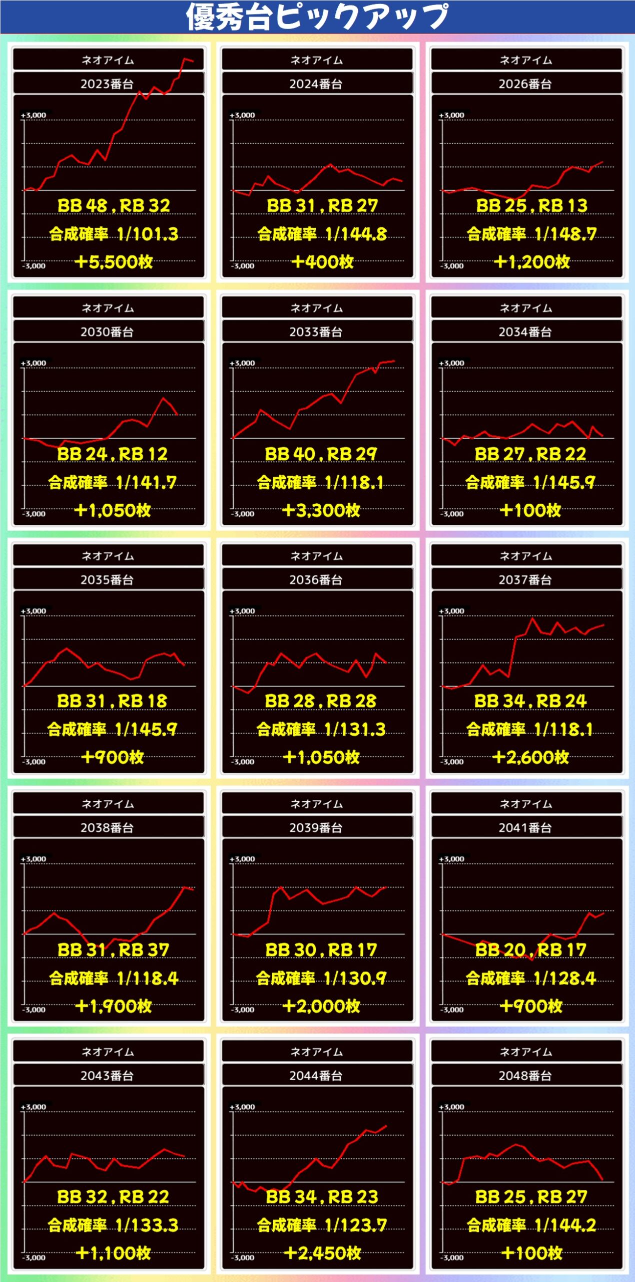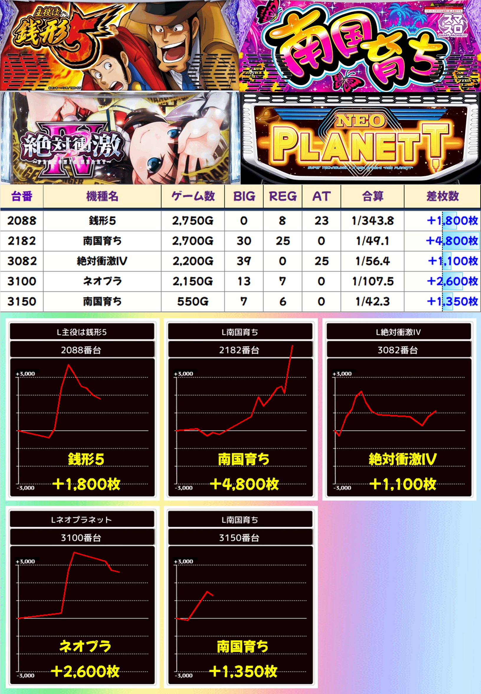 これだけ多くの機種に仕掛けがあったなかで、ほかにも単品の優秀台がチラホラ。南国育ちには+4,000枚オーバー台が、ネオプラに+2,000枚オーバー台があったりと、全エリアに満遍なくお宝が散りばめられていた様子が窺えます。