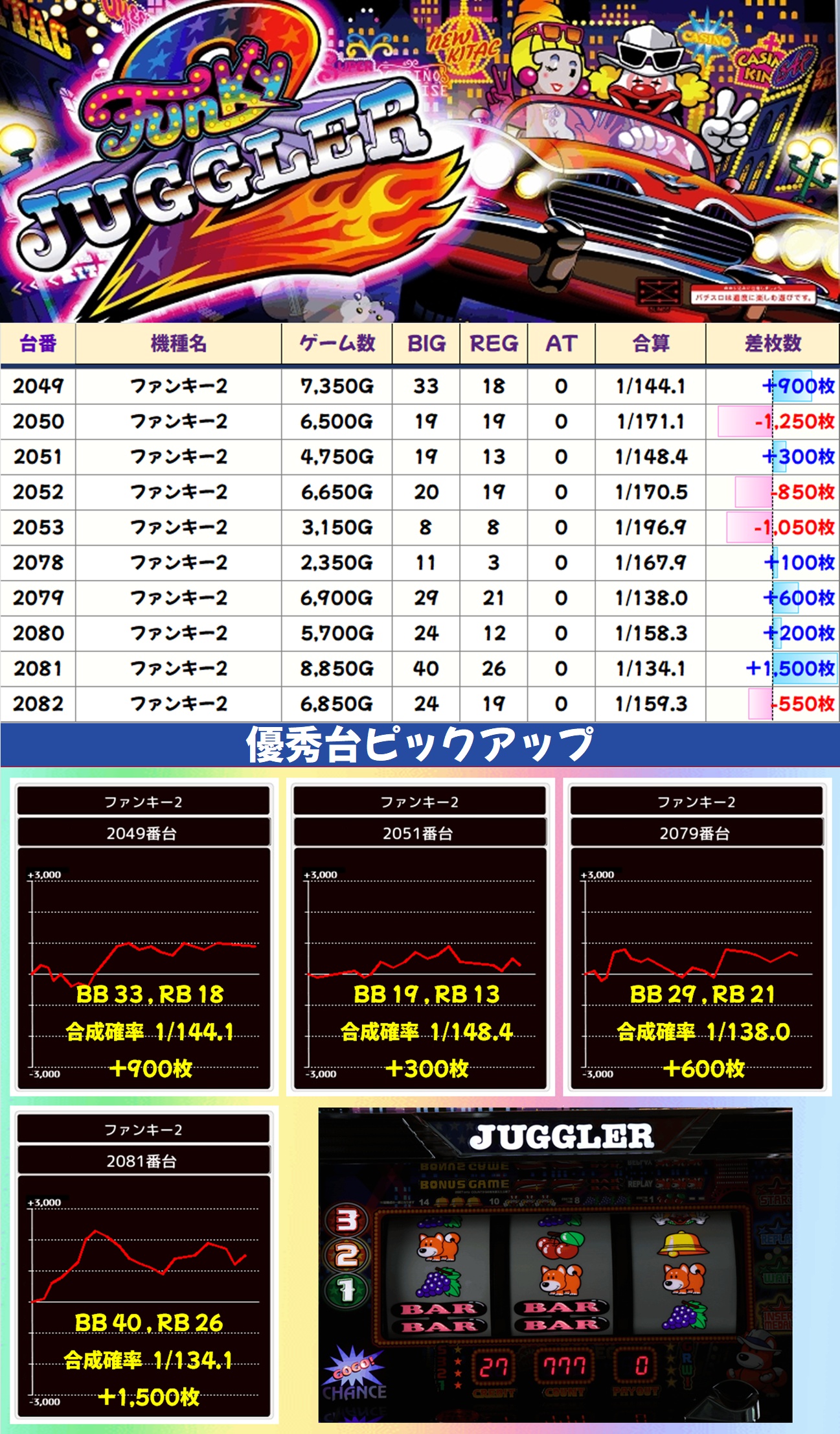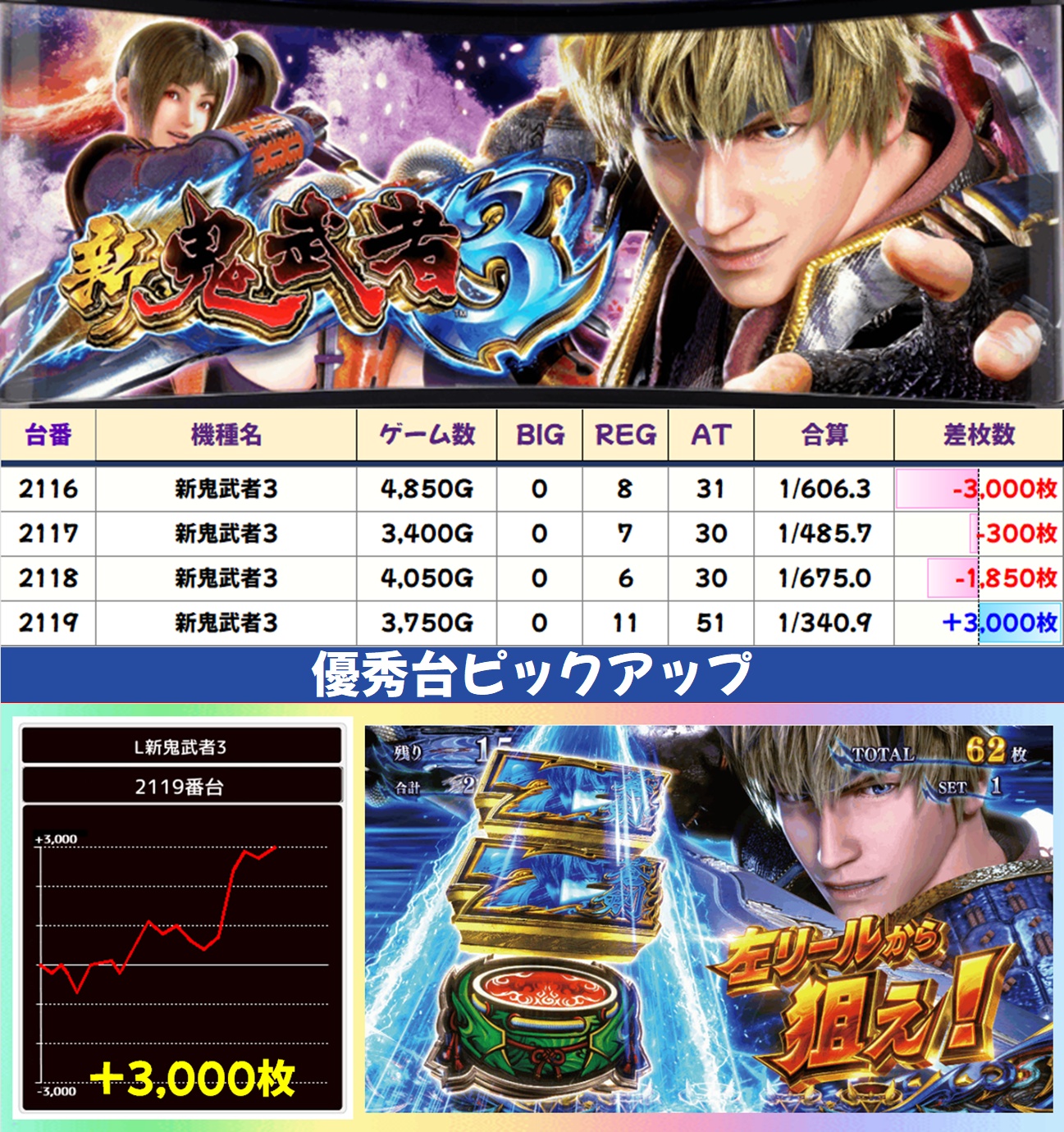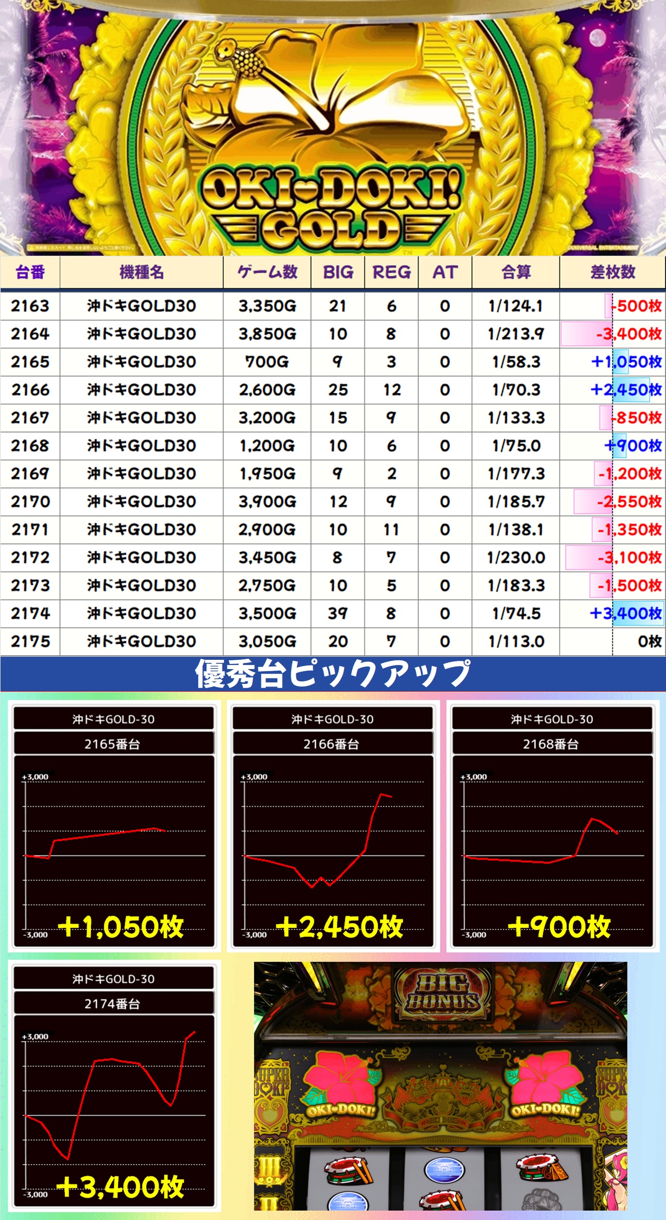 今回は全台系濃厚機種が4機種、1/2系以上濃厚機種が11機種、高配分機種が17機種という超大量仕掛けで至るところから優秀台が出現。どこからでも勝負可能な状況で、30台以上が+3,000枚オーバーを記録しました。
