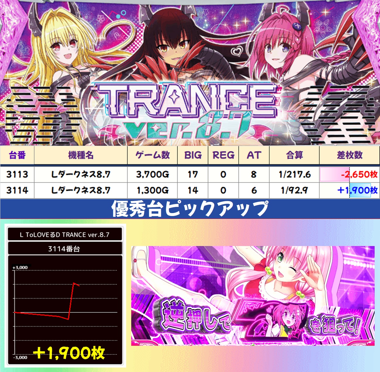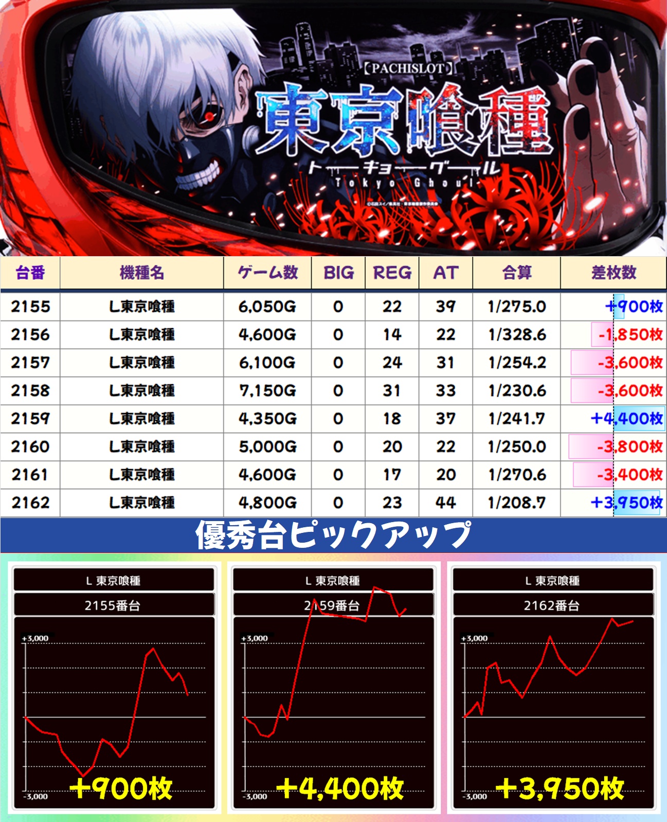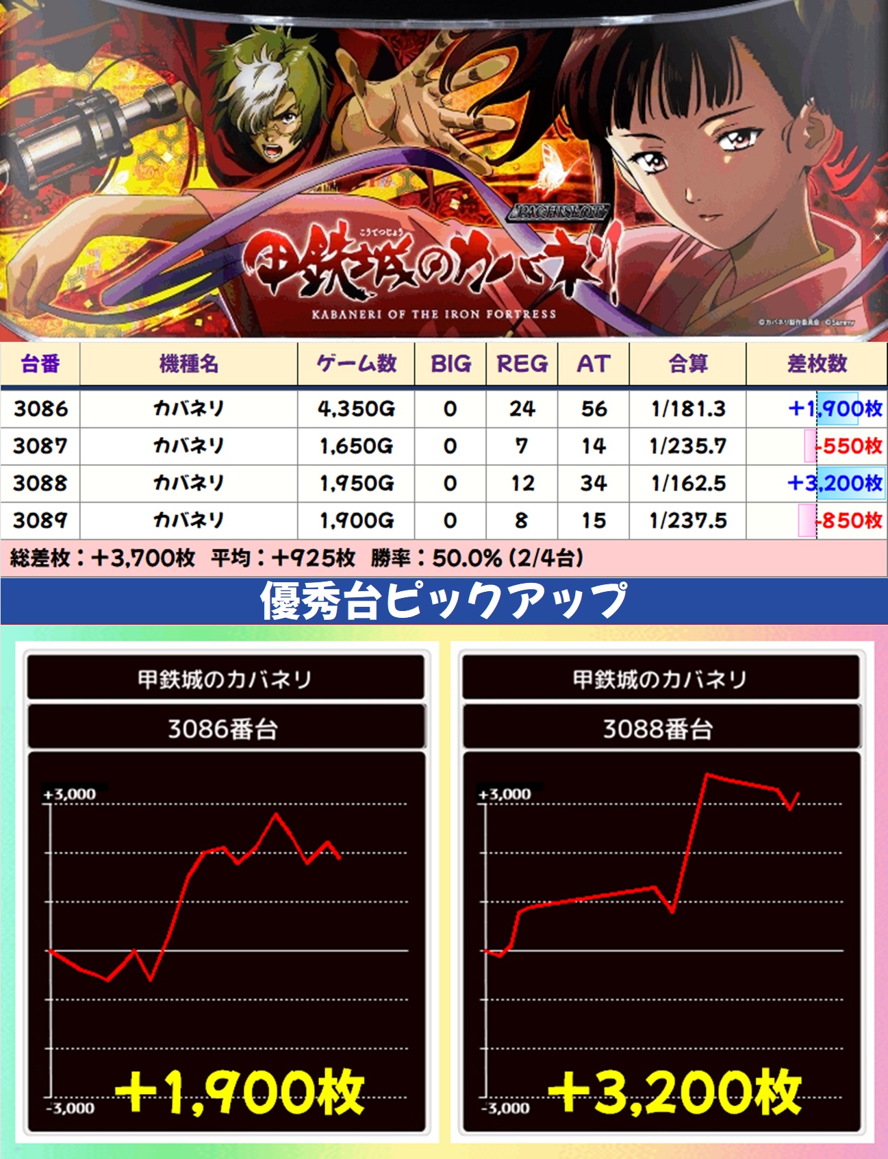 今回は全台系濃厚機種が4機種、1/2系以上濃厚機種が11機種、高配分機種が17機種という超大量仕掛けで至るところから優秀台が出現。どこからでも勝負可能な状況で、30台以上が+3,000枚オーバーを記録しました。