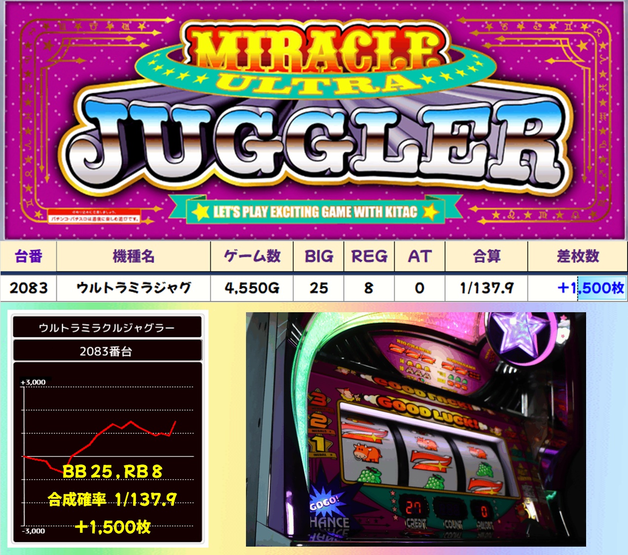 ほかにもハピジャグVⅢ・ファンキー2・ゴージャグ3が高配分と思われる内容で、ウルトラミラジャグにも+1,500枚の優秀台が確認できました。前述したように、ジャグラーシリーズは毎回強めになっているため、堅い勝負を好まれる方にはかなりオススメです。